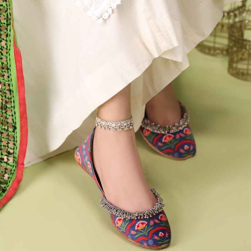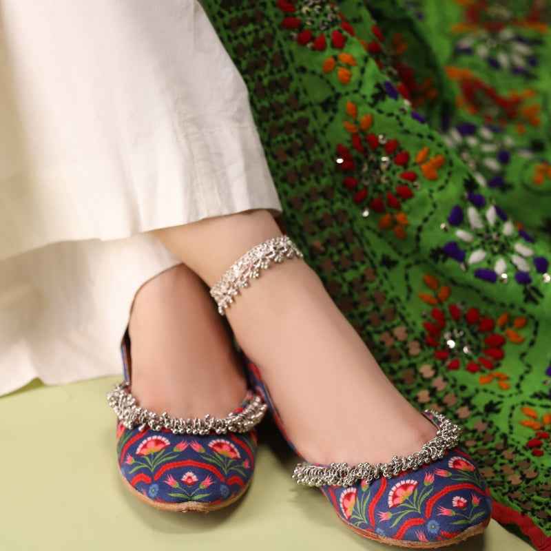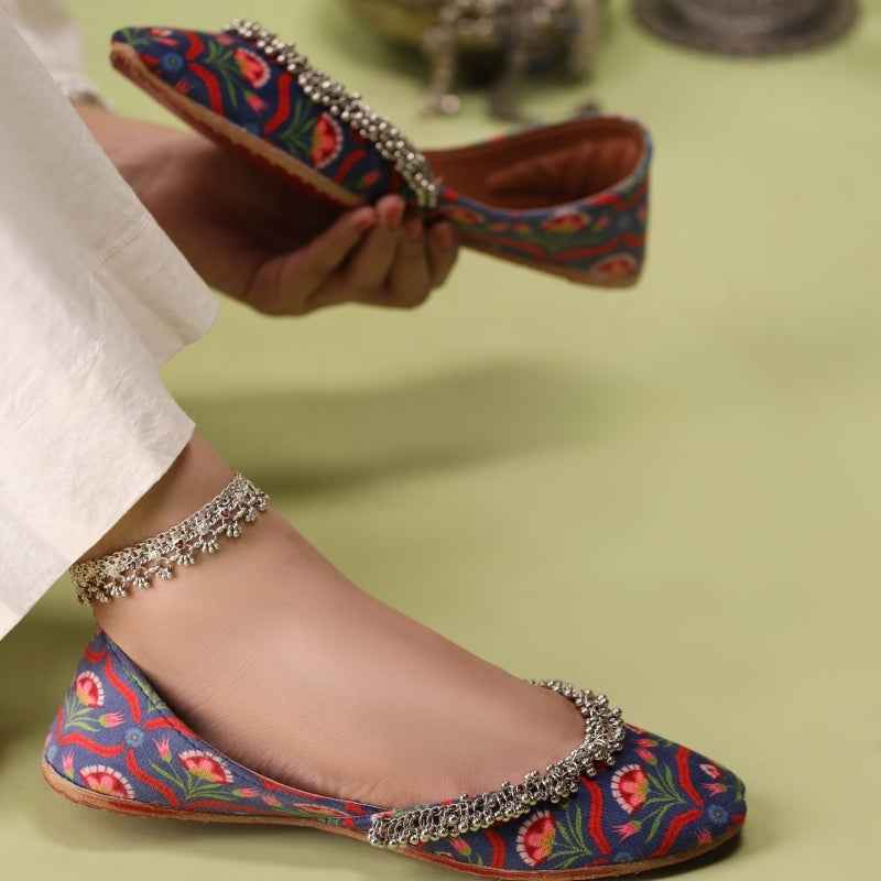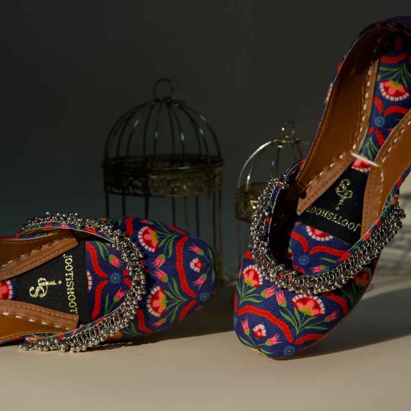 Our Twilight Tulip khussa features stylized coral tulip and verdant vine motifs digitally printed on velvet, drawing inspiration from traditional block-printing techniques and is framed by a delicate metallic-bead fringe that catches the light with every step. As each pair is assembled entirely by hand, slight variations in print intensity and bead placement make yours truly one-of-a-kind. Style them with ivory linen trousers and oxidized silver anklets for a breezy daytime look, or let the floral palette pop against a charcoal kurta for evening sophistication. To keep them looking their best, gently spot-clean with a damp cloth and store in a cool, dry place away from direct sunlight.
