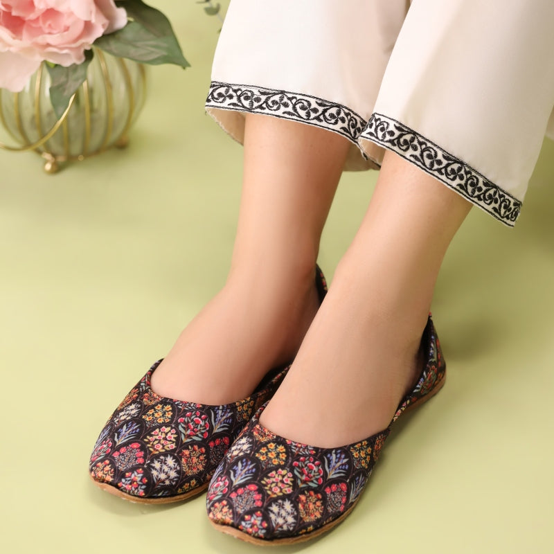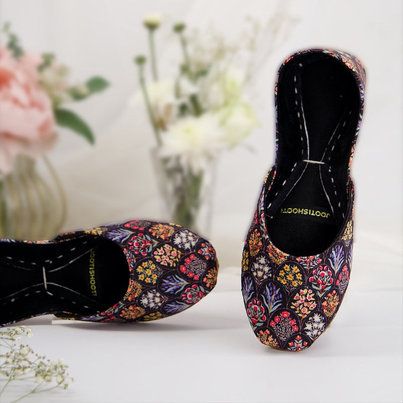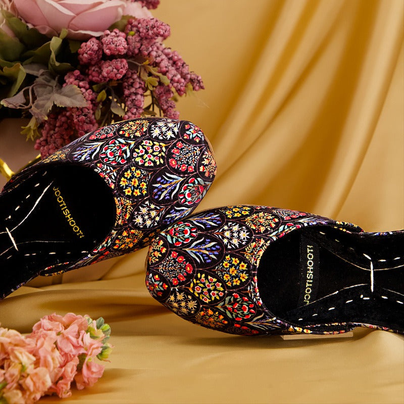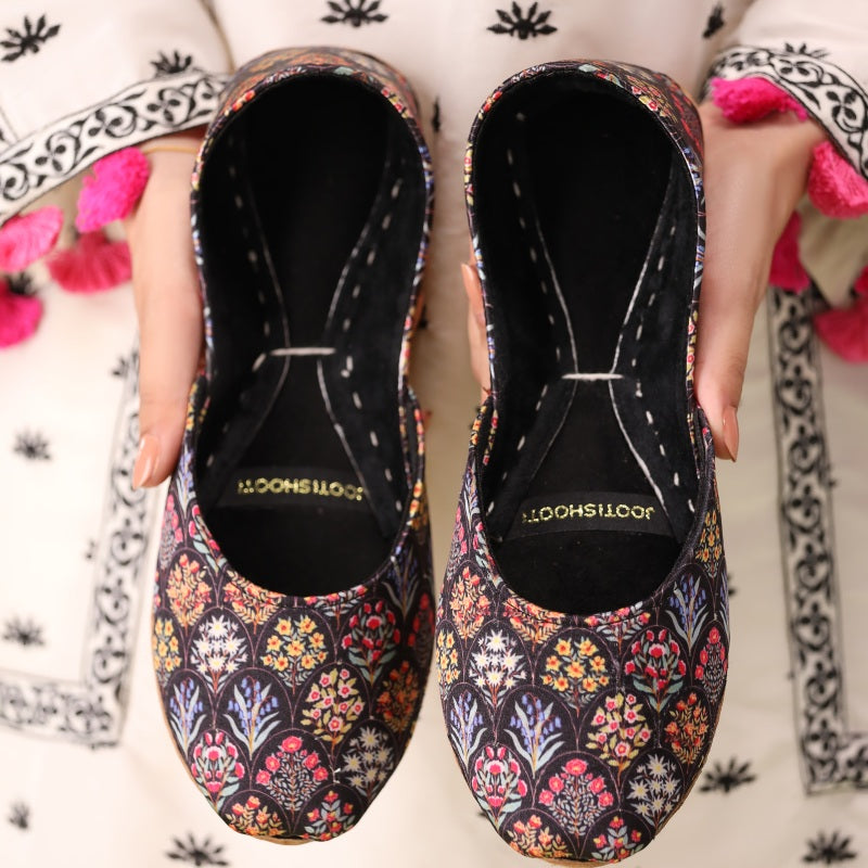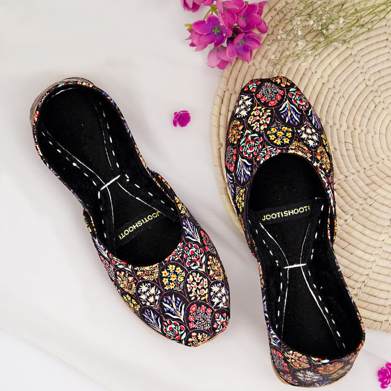 Embrace a blend of tradition and vibrancy with our "Laila" Khussas. This handcrafted pair features a rich, multi-colored floral pattern set against a deep, dark background, creating a captivating and sophisticated look. The plush black interior ensures both comfort and elegance. Perfect for adding a touch of artisanal charm to your ensemble.
