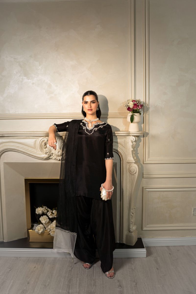 Step into sophistication with "Anna," our stunning pure sheesh silk short kameez & flaired shalwar! This exquisite outfit comes with a delicate organza dupatta adorned with a chic four-sided border. The neckline is a showstopper, featuring intricate adda work with dabka, naqshi, cutdana, and sitara that adds a touch of grace and elegance. Perfect for any celebration, "Anna" is your go-to for a timeless, stylish look. Embrace your inner royalty and shine bright!