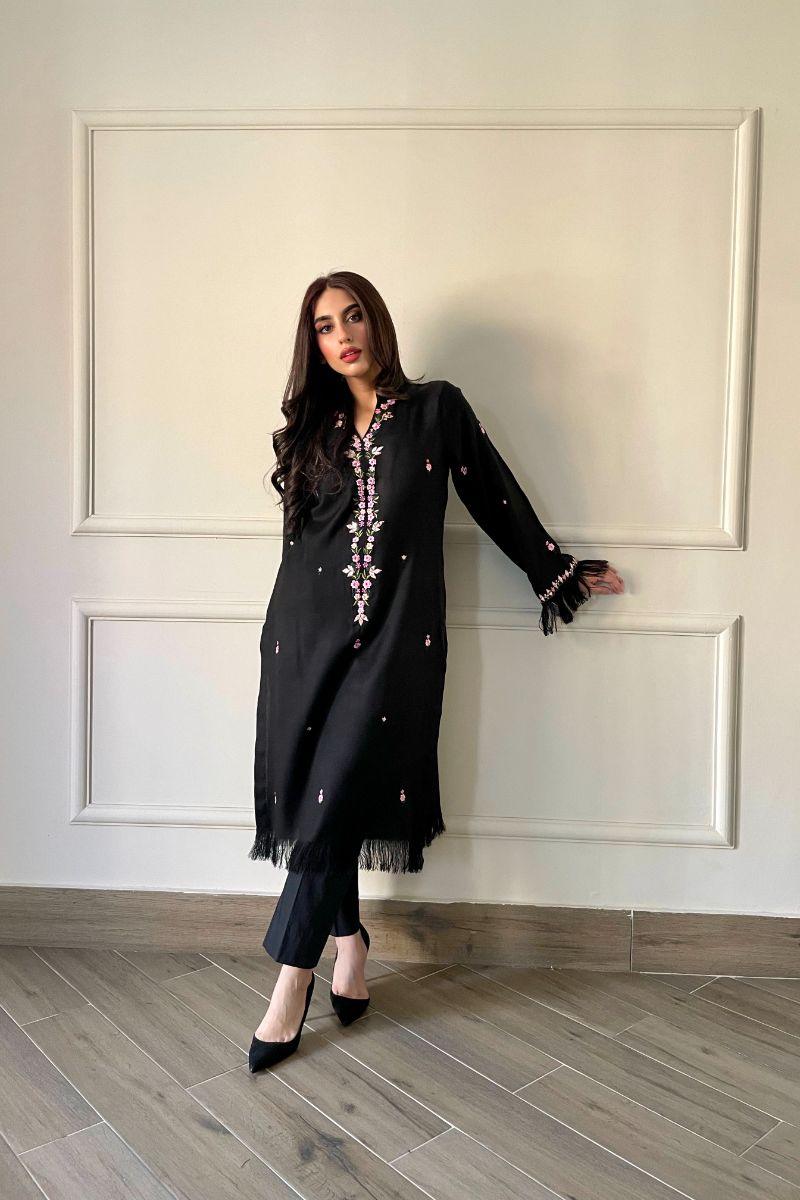 A black Pashmina shirt featuring an embroidered floral neckline and sleeves, fringes on the sleeves and hem, and scattered floral bud embroidery throughout.