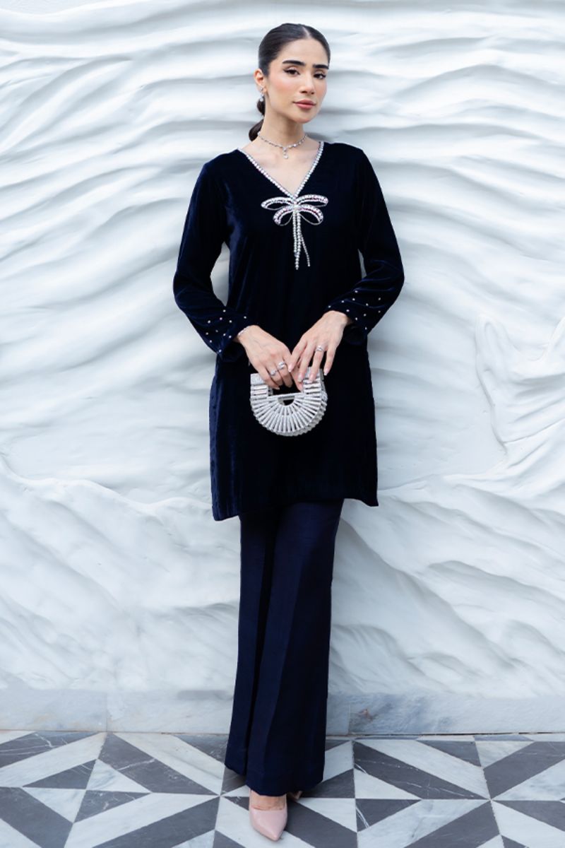 Genilia blends classic navy blue velvet short shirt with hand embellished bow on the neck & Korean silk boot-cut pants for a chic look. A total head turner for the chilly season.