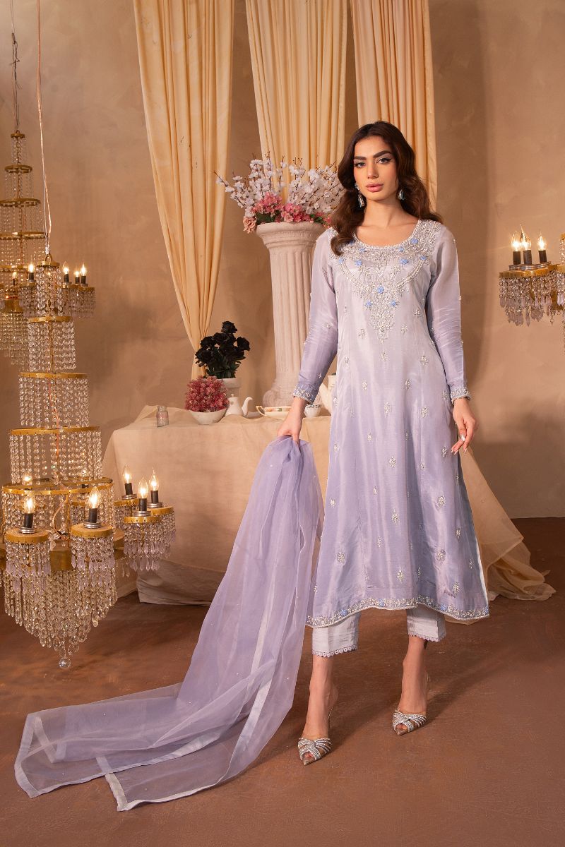 n A-line shirt in serene ice blue, adorned with intricate Risham French knots in silver and mauve. Hand-embellished with dabka and zardozi crystals, it exudes timeless sophistication. Complete with an ethereal organza dupatta, Lavica is the epitome of elegance for any occasion.