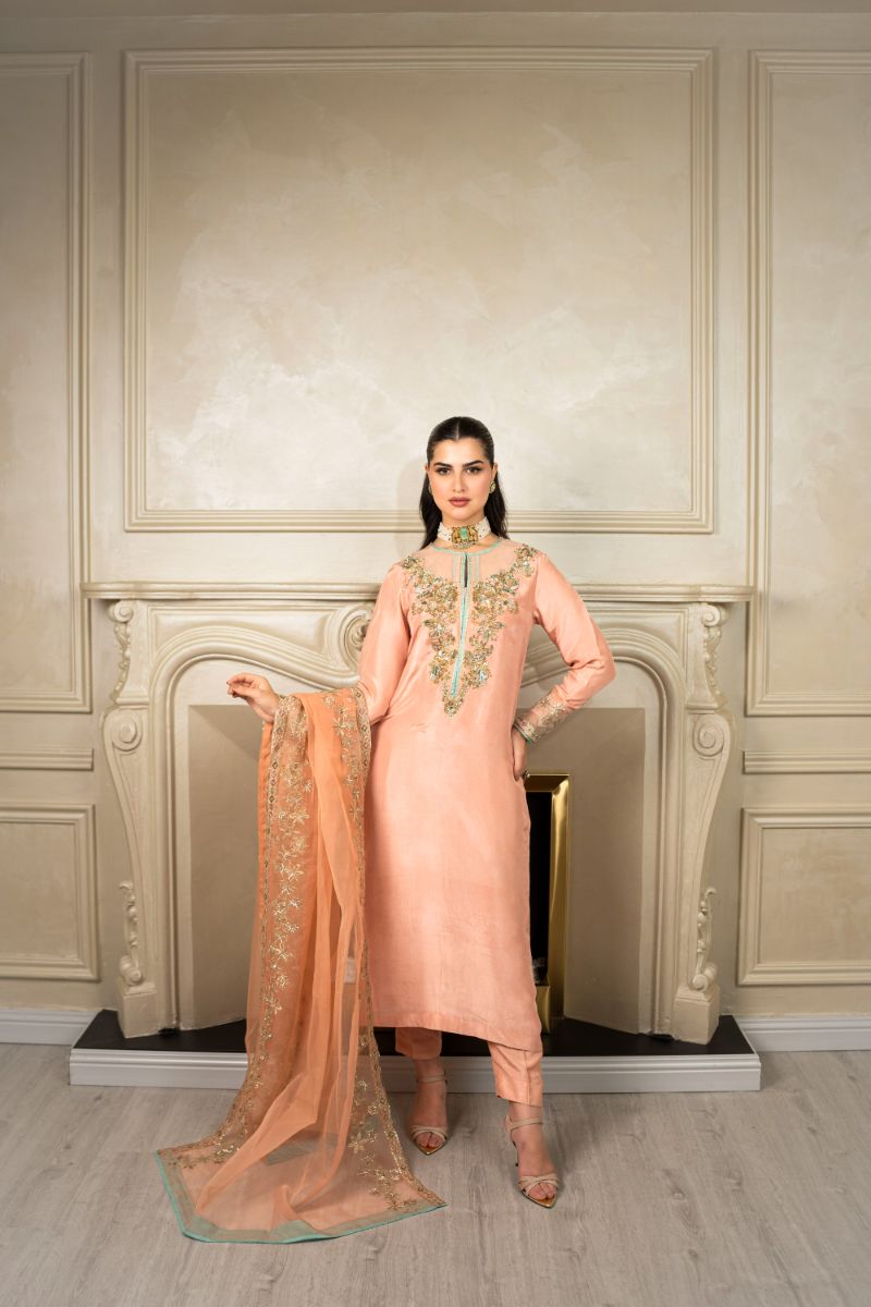 "Layla," featuring an exquisite neckline adorned with intricate adda work, showcasing beautiful dabka, naqshi, cutdana, and sitara. This stunning detail adds a touch of timeless elegance that captivates at every glance. Complementing this is a delicate organza dupatta with a chic four-sided border, perfectly enhancing the ensemble's sophistication. Crafted from pure sheesh silk in a lovely peach hue, "Layla" is the ideal choice for special occasions.