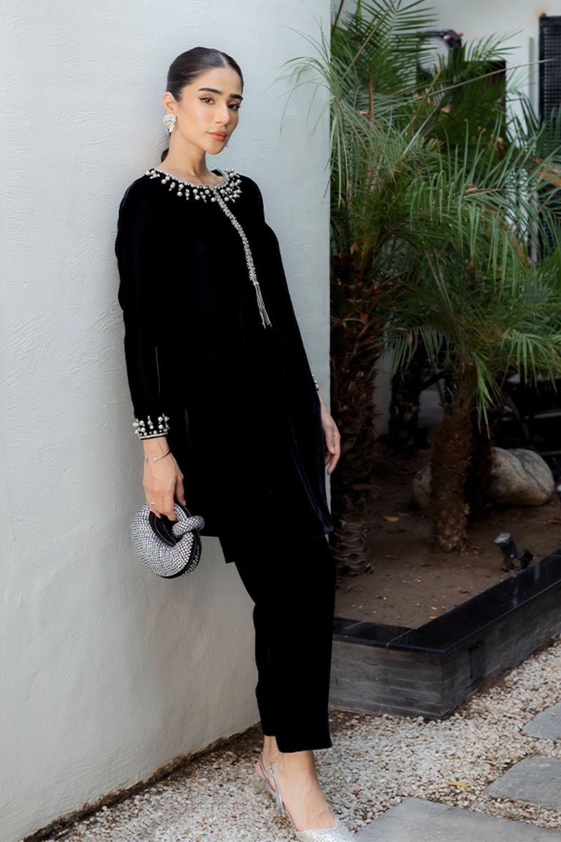 Pearl Eclipse captures timeless glamour in black velvet. The short straight shirt and matching cigarette pants create a chic, tailored silhouette, while delicate hand embellishments and statement pearls add a whole lot of sparkle. Ideal for those seeking elegance with a modern twist.