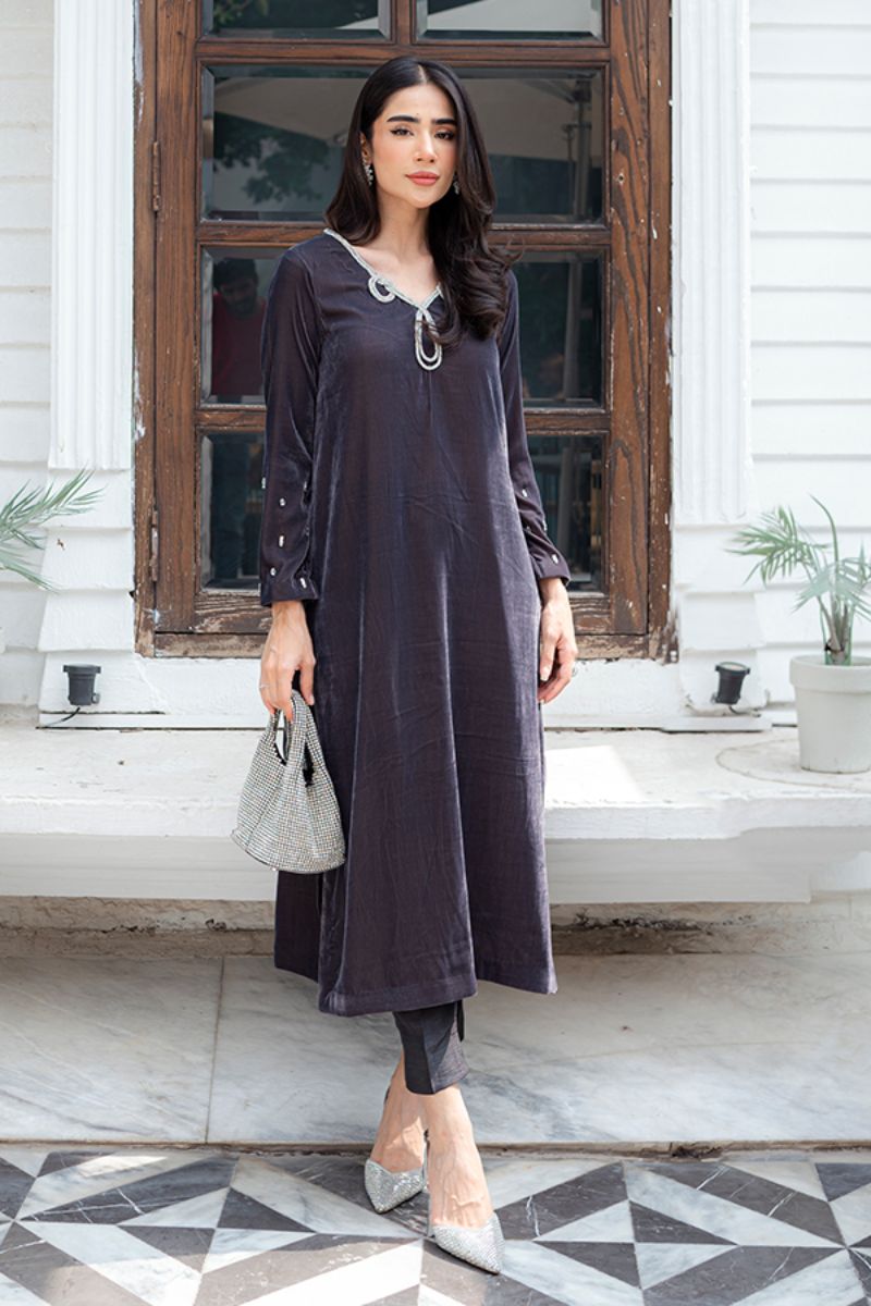 Regal Ash exudes quiet elegance with its grey velvet A-line shirt and delicate embellishments. Paired with Korean silk cigarette pants, it offers a timeless, refined look. Regal Ash is for those who appreciate simplicity with grace and sophistication.