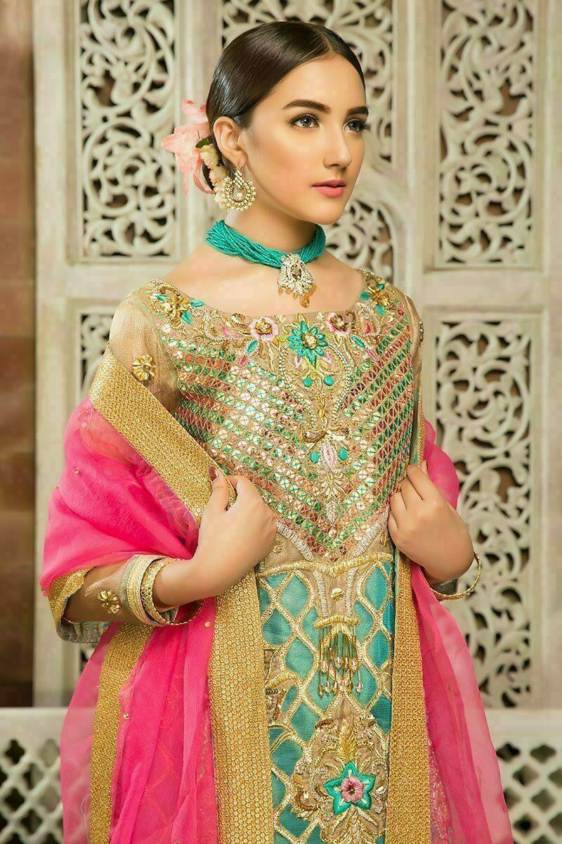 Ferozi net shirt with pattern work with charma dori and adda embellishments. Fully worked shirt. Border with heavy work and cut dana and stones hangings. Back with vertical laces. Styling sleeves with flowers spray. Pink Organza dupatta with four side lace border. Gold trouser. (3 PC- stitched outfit)