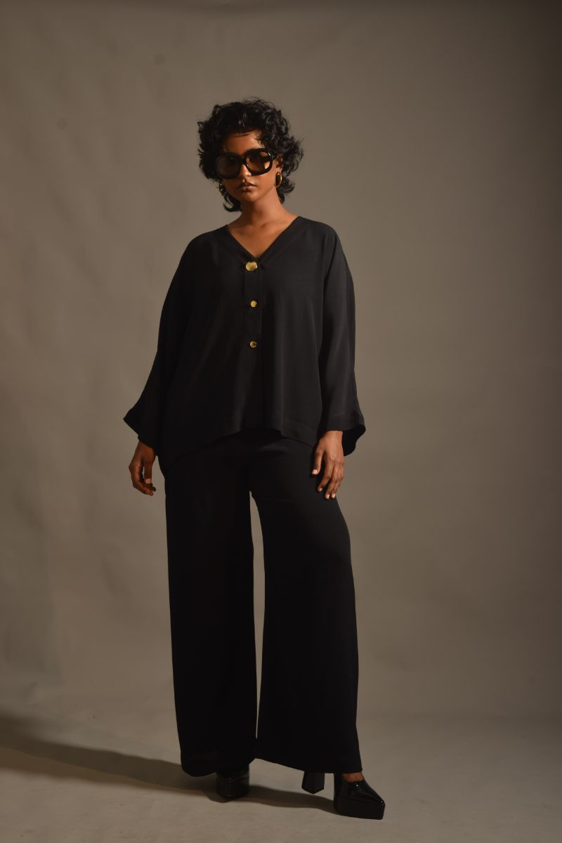 Stand out in our striking Noir Set. A loose cut button down top adorned with metallic gold buttons and a graceful curved v shaped neckline. Paired with matching flowy trousers with pockets for an ultimate chic comfortable look.