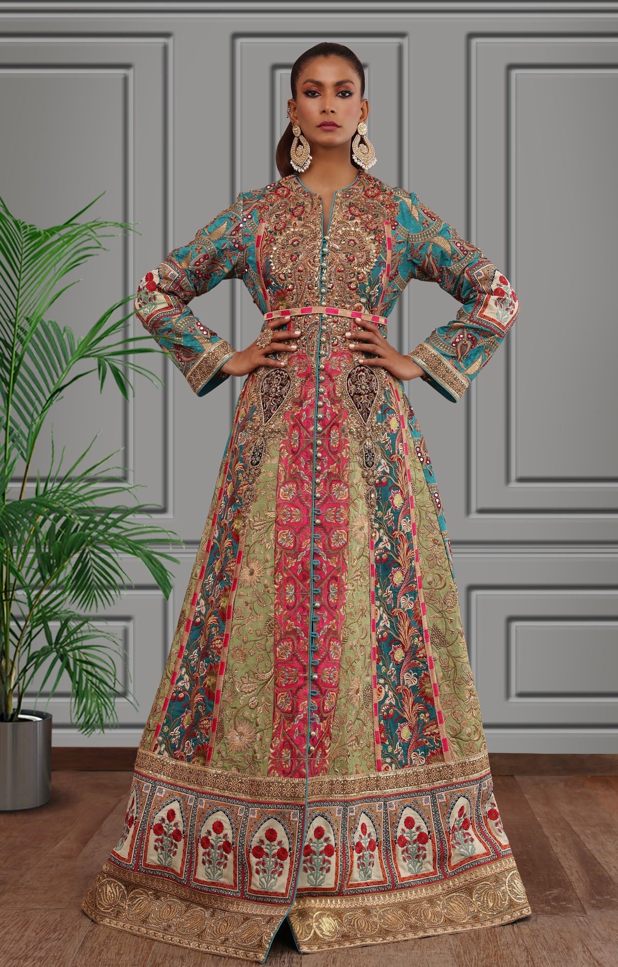 Ethnic floor length flowy outfit beautiful rich colour blocking each panel is handcrafted with resham and tila thread embroidery enhanced with sequins beautiful heavy galla created with resham thread and zardozi work beautifully created motifs on the panels are made with zardozi and applique work. Finished with handcrafted resham thread, tila thread and sequins borders. You can order through website or call or have an appointment with Shamaeel to customize colors of your choice.