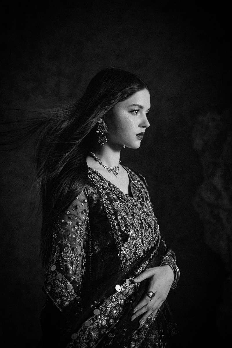 Featuring an embroidered and hand-embellished neckline, front, and sleeves on organza, paired with a printed Indian raw silk inner and trouser.The look is completed with a heavily embroidered dupatta and ornate borders that capture regal artistry in every thread