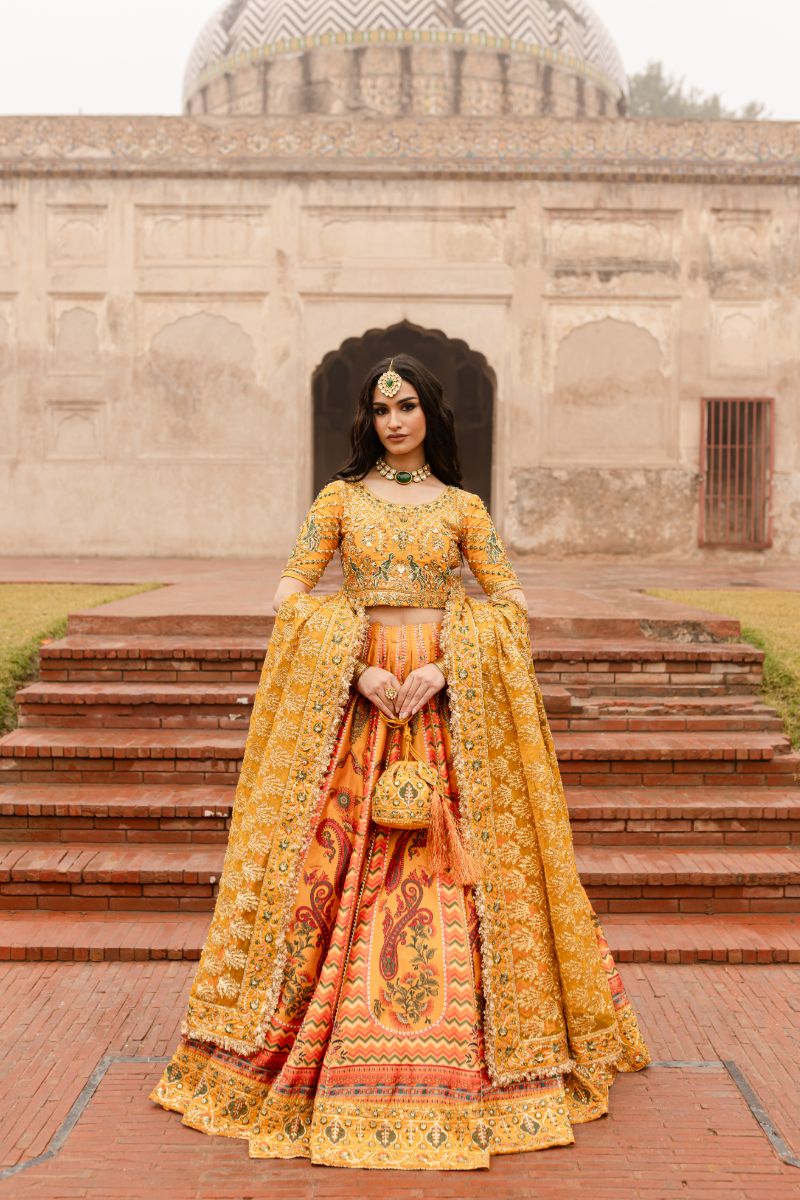 Embroidered & hand-embellished Choli with intricate neckline details, paired with a High Waisted printed lehnga featuring tilla & sequins-embroidered border. Complemented by an organza dupatta with sequins embroidery.