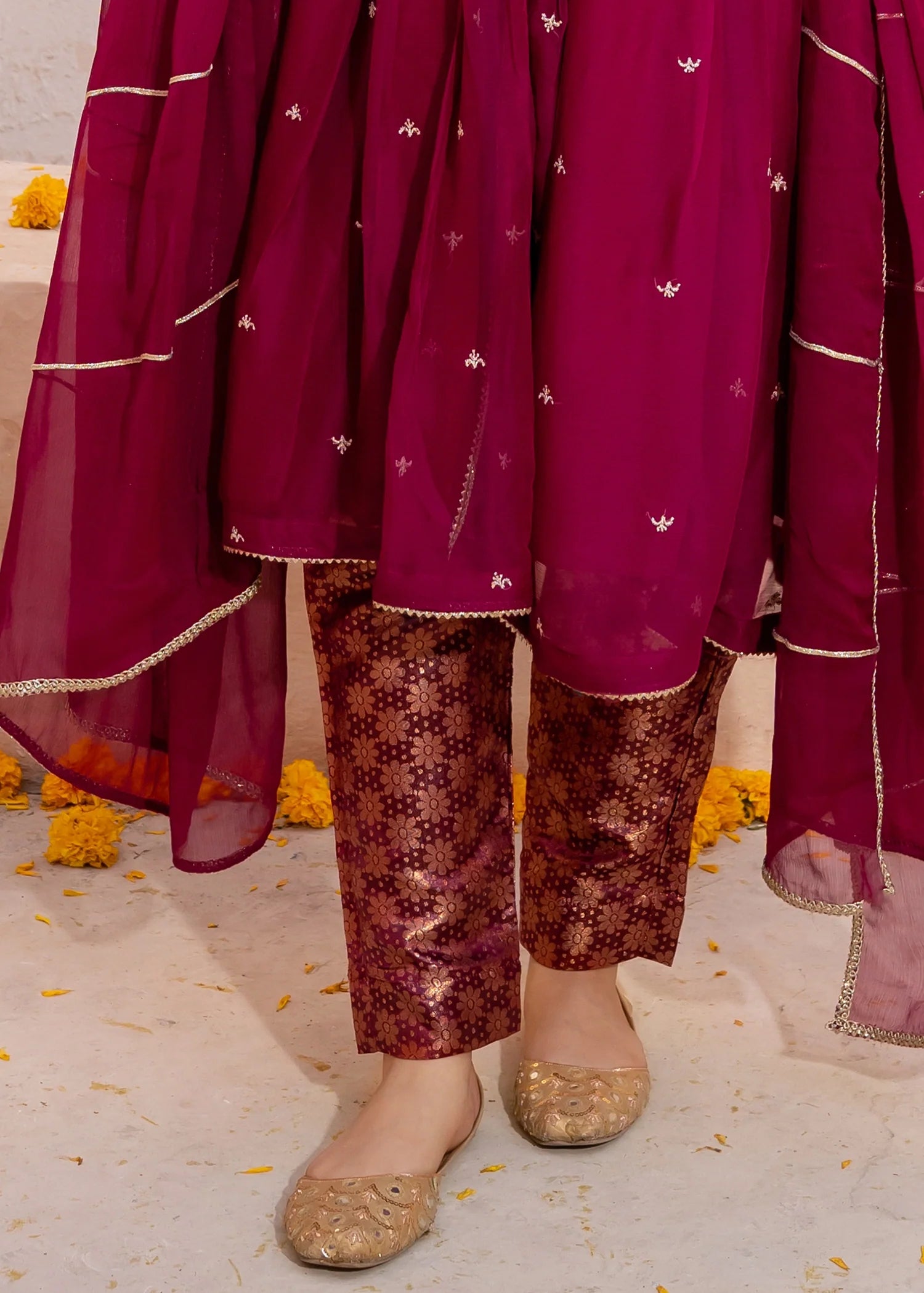 Bottom: Maroon straight trouser with flower print