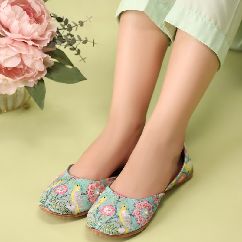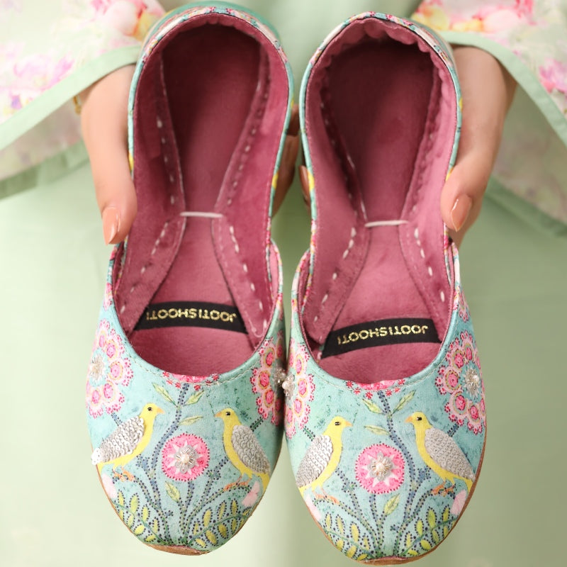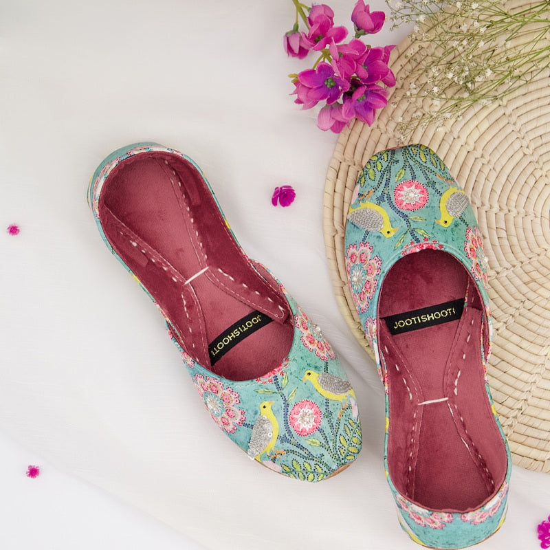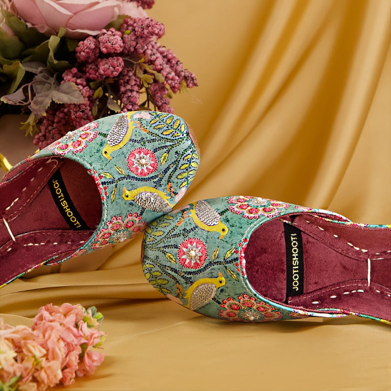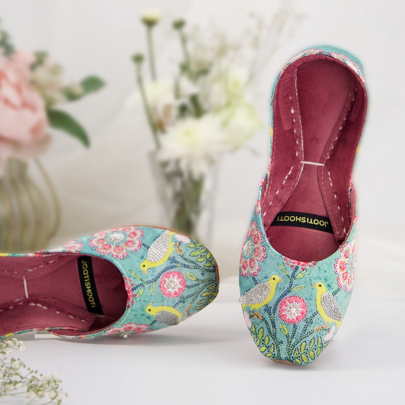 Add a touch of playful elegance to your footwear collection with our "Masakali" Khussas. This handcrafted pair feature a delightful teal background adorned with intricate pink floral patterns and charming bird motifs. The rich pink interior adds a pop of color and ensures exceptional comfort. Perfect for those who appreciate unique, artisanal footwear with a whimsical touch.