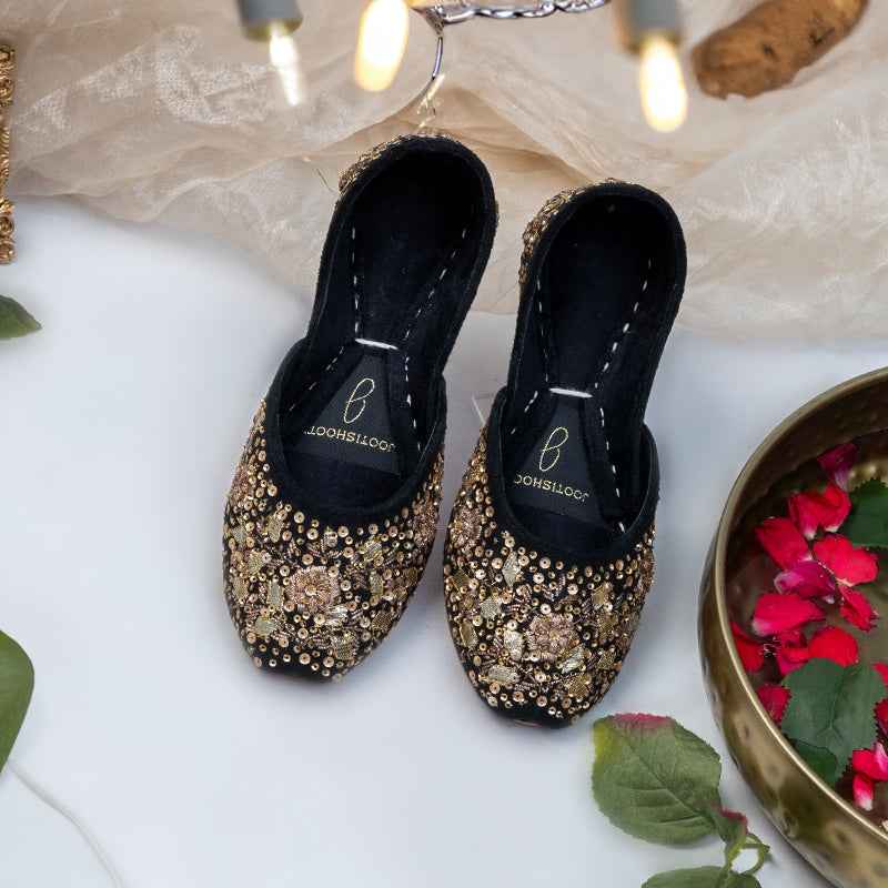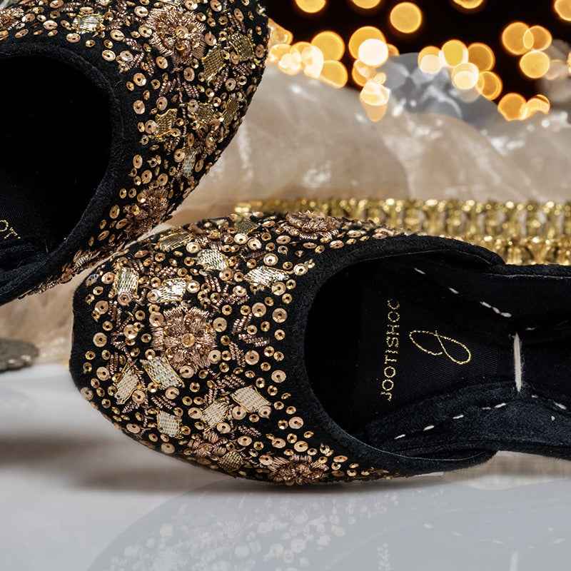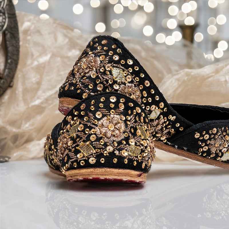 Rich velvet khussa, Meher is adored with gold gotta patti and sequins, a pair that'll add instant glamour to your look without a compromise on comfort. This festive season, you'll find more than a few occasions to let it shine.