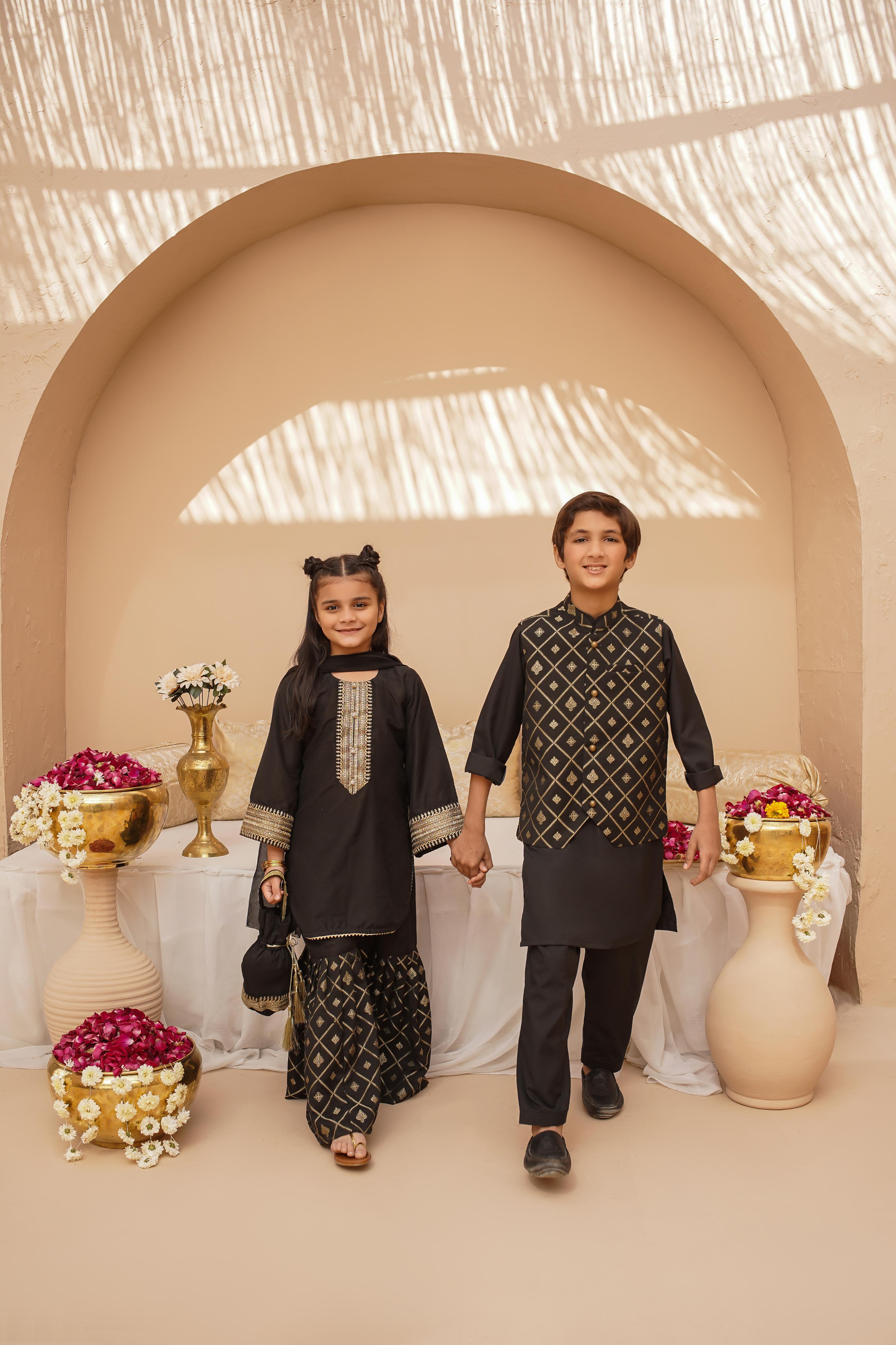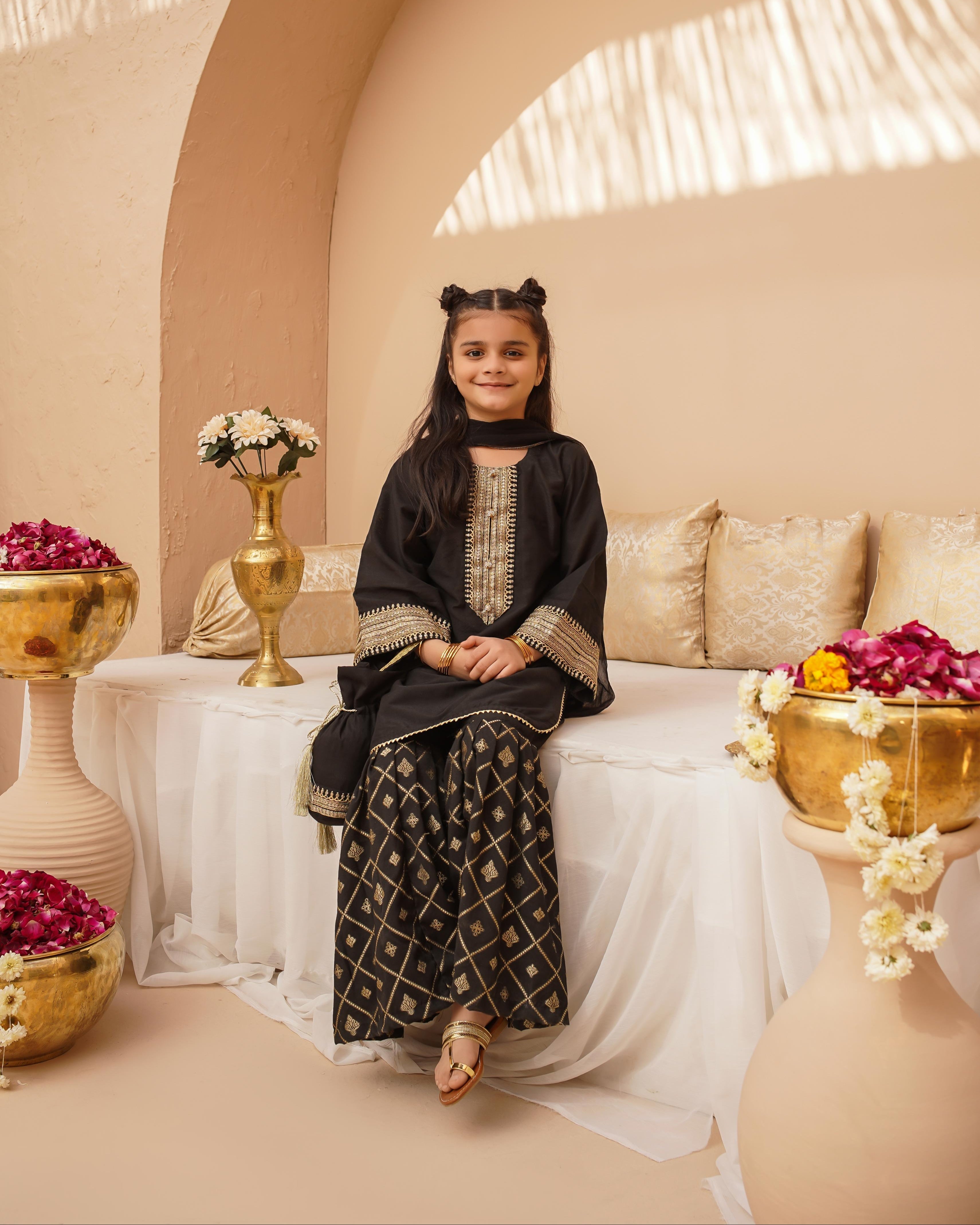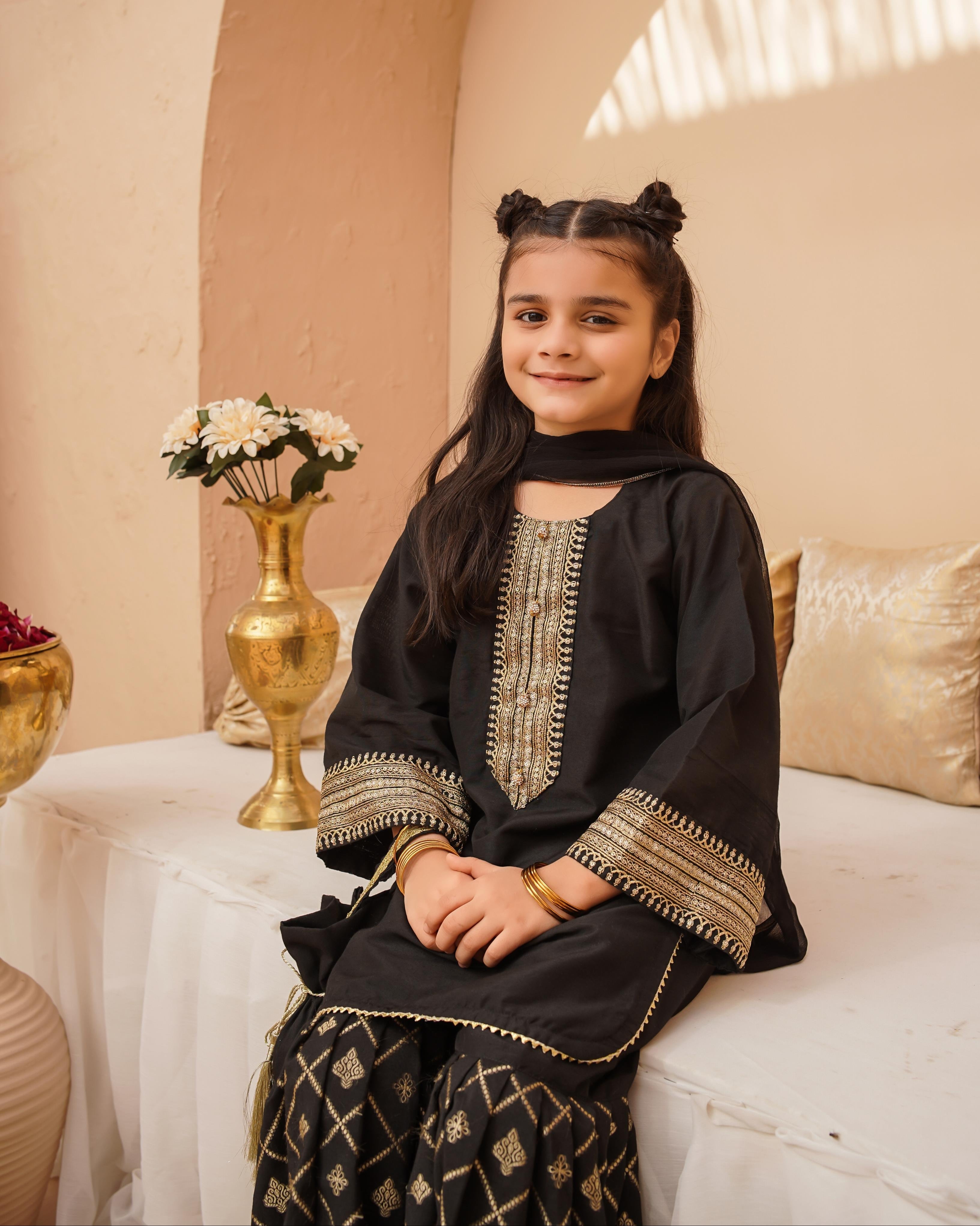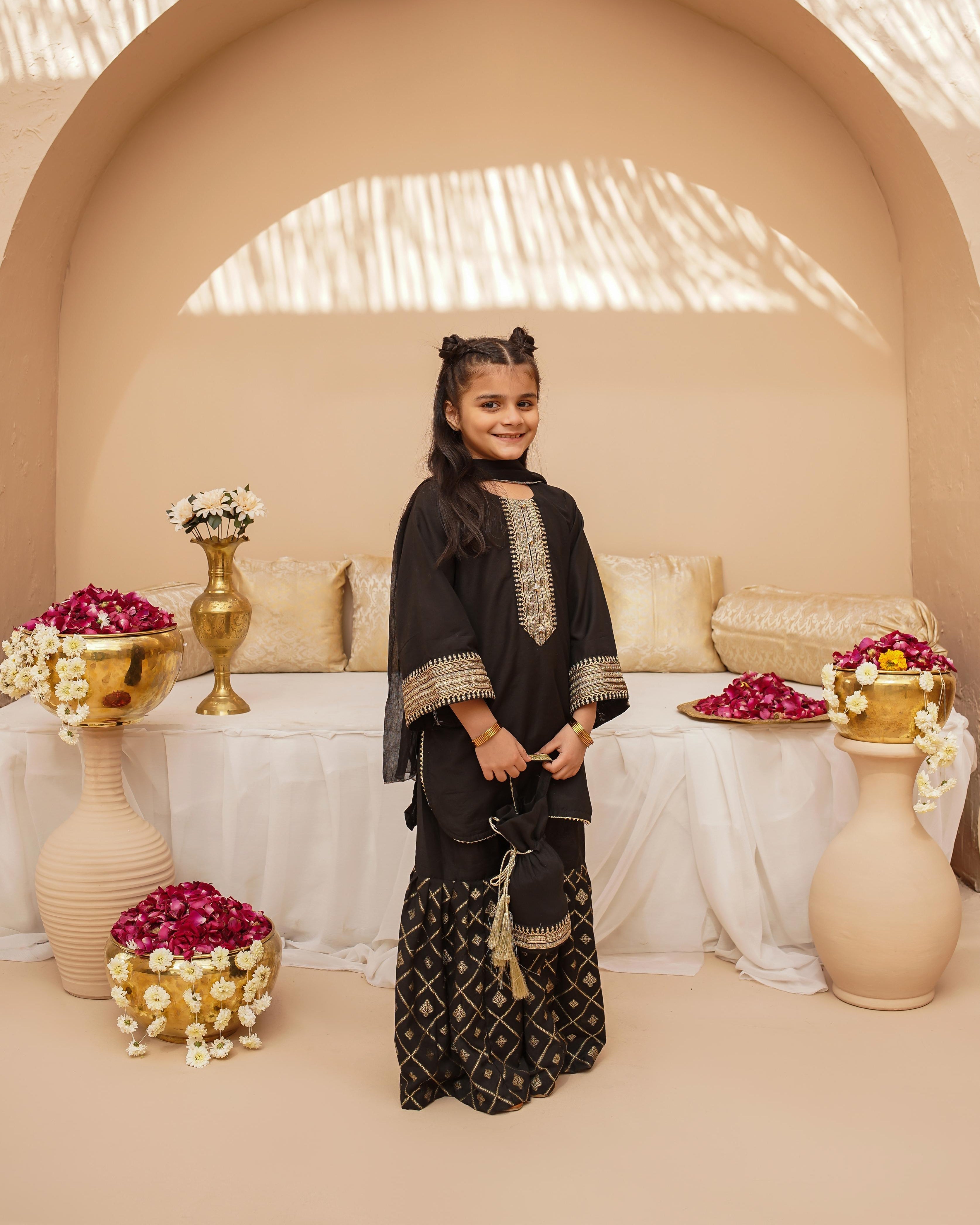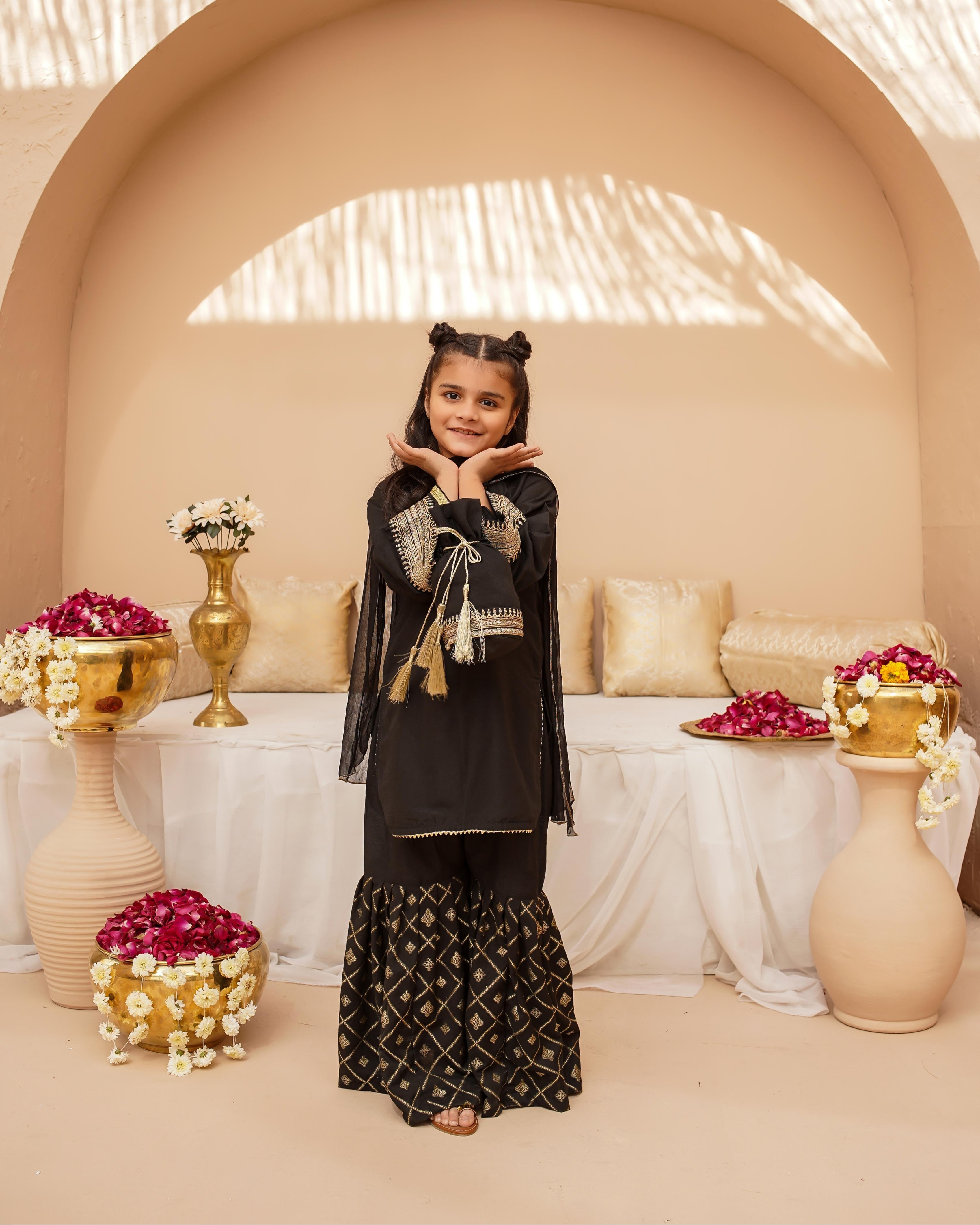 Dress your little one in timeless elegance with this beautifully crafted three-piece ensemble. The top is made from luxurious cotton silk, adorned with delicate Zari and sequins embroidery. Featuring stylish bell sleeves. Paired with a Jacquard printed gharara, the bottom enhances the traditional appeal.