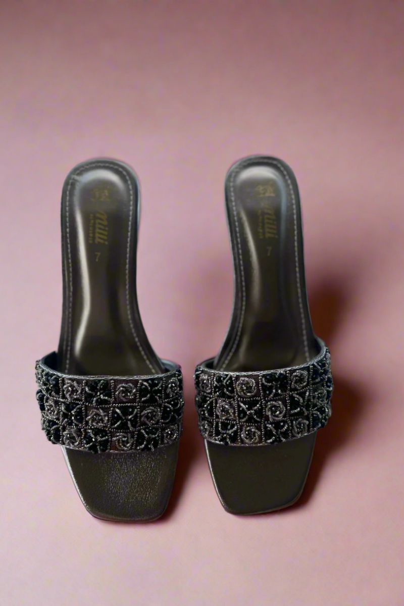 Step into sparkle and fun with these Floral Formal Slides! Featuring rainbow silver and golden rhinestone embellishments on a big flower, strappy seesha rexine upper, they add a pop of shine to any outfit. The plain padded insole ensures comfort while you play, dance, or simply stroll in style. Perfect for brightening up your day with a playful touch!