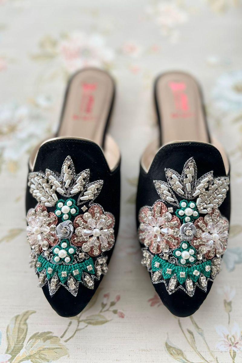 ormal Mules: a masterpiece of elegance and comfort. Hand-embroidered with a lavish combination of crystals, pearls, and stones delicately woven into a stunning tapestry of thread and ribbon, these mules exude opulence with every step. The silver piping, set against a sleek black base, adds a touch of sophistication, elevating your ensemble to new heights of style and grace. But beauty is not sacrificed for comfort. With a foam cushioned sole, these mules ensure you can dance the night away without missing a beat. Slip into luxury and step confidently into any formal affair with our chic Formal Mules.. Upper: Rexine Bottom:Foam Cushioned Sheet Sole Please note: Due to the handmade nature of the collection and professional photography lights; colors, and/or patterns may vary slightly from the image shown. Minor differences enhance the beauty and uniqueness of each style