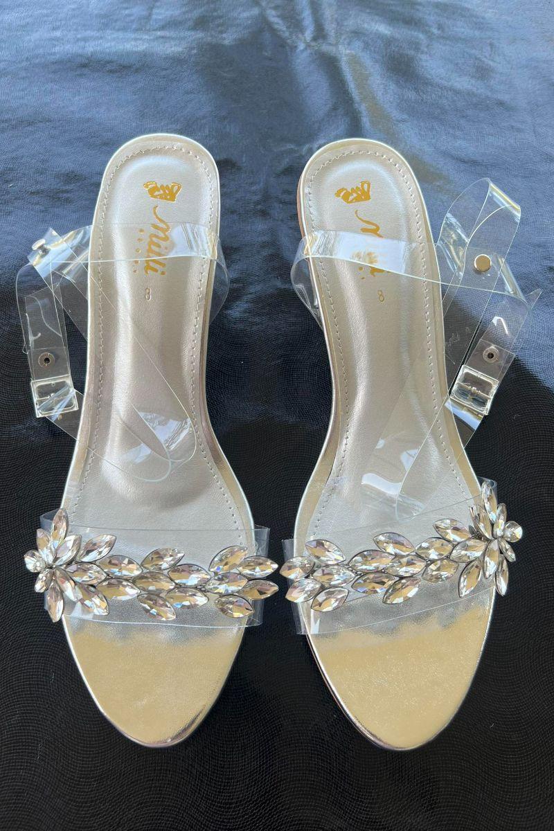 Step into the world of luxury with our Glass Cinderella heels! The see-through glass rexene adds a classic touch while the silver stone work on the strap brings a touch of elegance. Ankle grip strap provides comfort and stability. Indulge in a fairytale dream with every step!