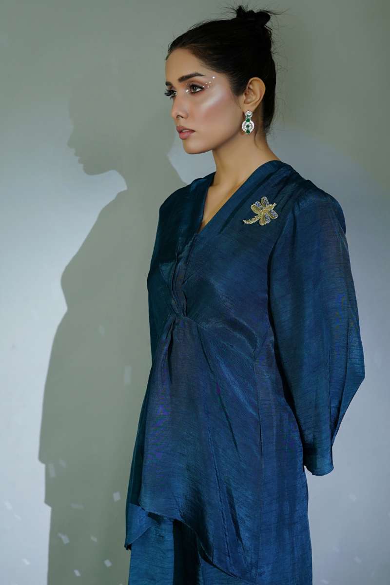 2-piece set. This trendy co-ord made in beautiful silk fabric is meticulously designed with a draped twisted top with overlapping front. An exquisite hand embellished motif is appliqued near the shoulder. The top is loose cut with open three quarter sleeves with pearl tassel drop at ends. The top is chicly paired with a matching silk wide leg pant.