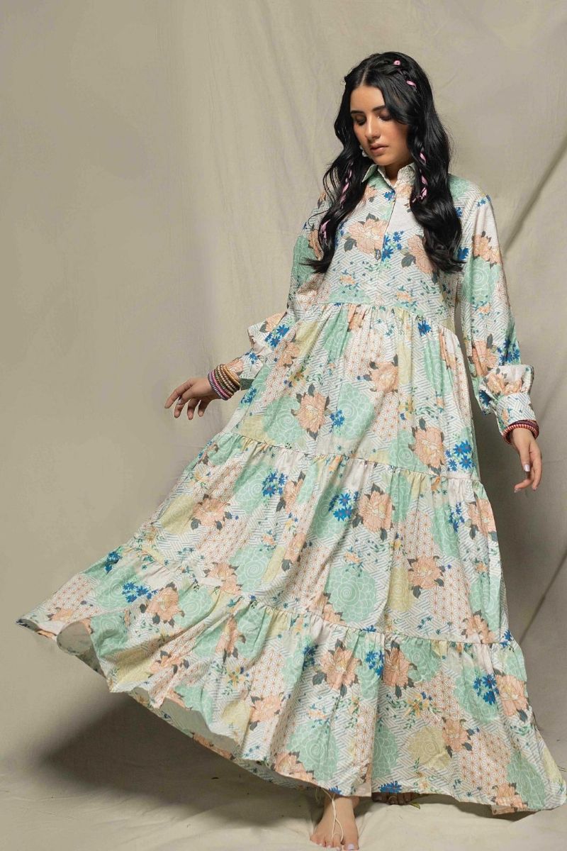 Designed in an exlusive Minutiae print. Ankle length dress with shirt collar & front button opening. Multiple Tiers for extra flare. Side pockets. Long sleeves ending in cuffs. Comes with a separate fabric belt.