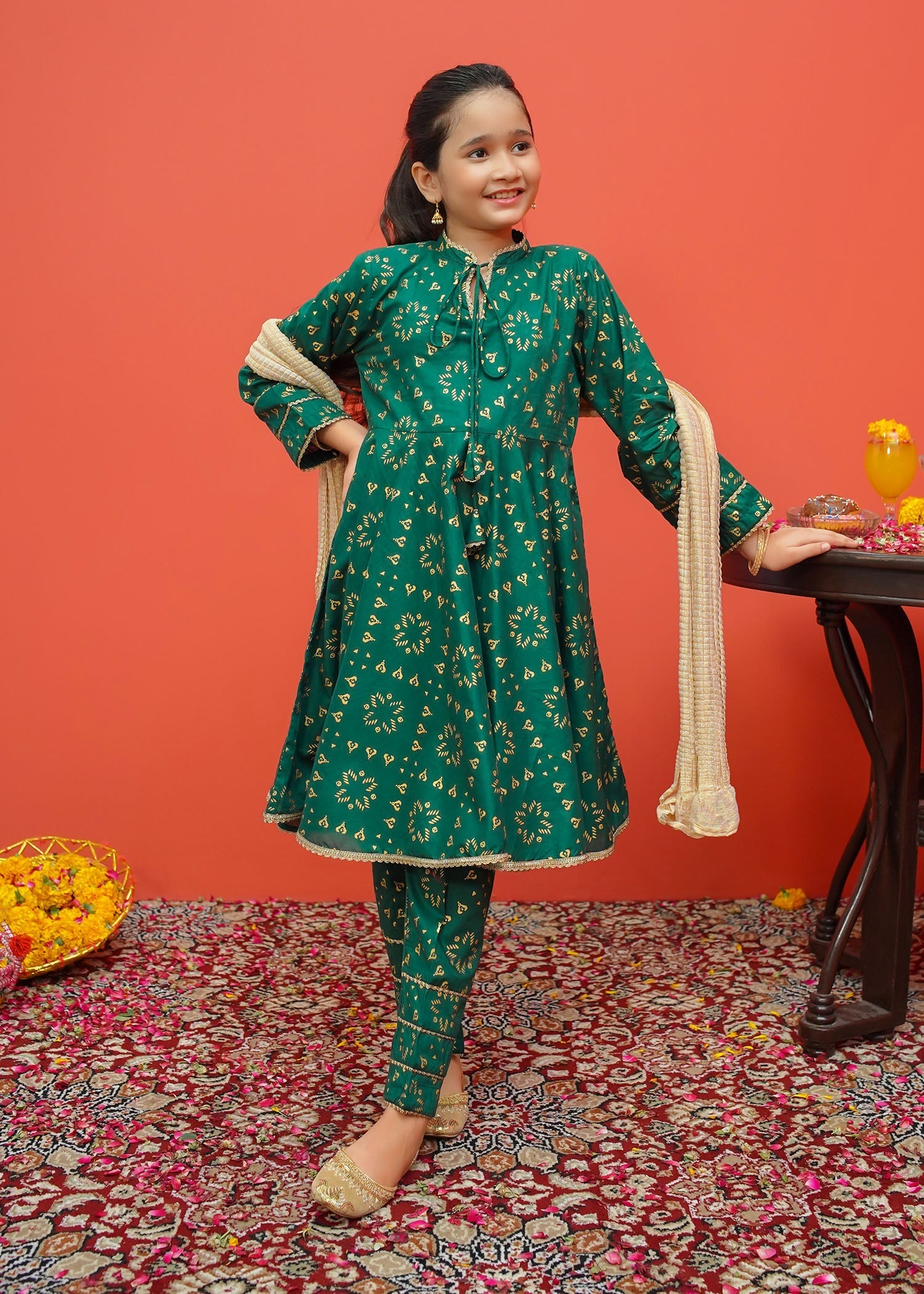 Three piece printed ensemble in frock style paired with golden crush dupatta and straight fit trousers.