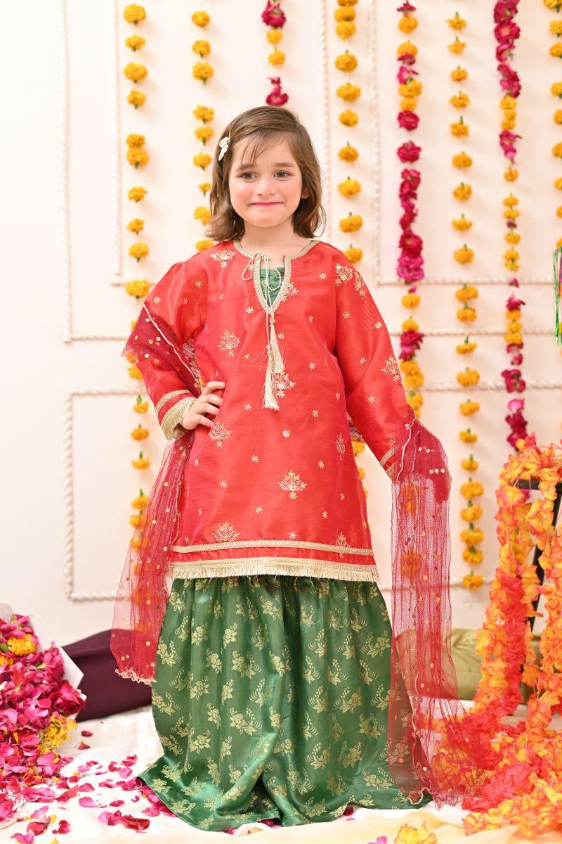 Shirt: Red Raw Silk with zari boti work finshed with soft golden dori from the neckline and nice golden kiran lace on daman Gharara: Green Banarsi Floral print Dupatta: Maroon Net with golden dots