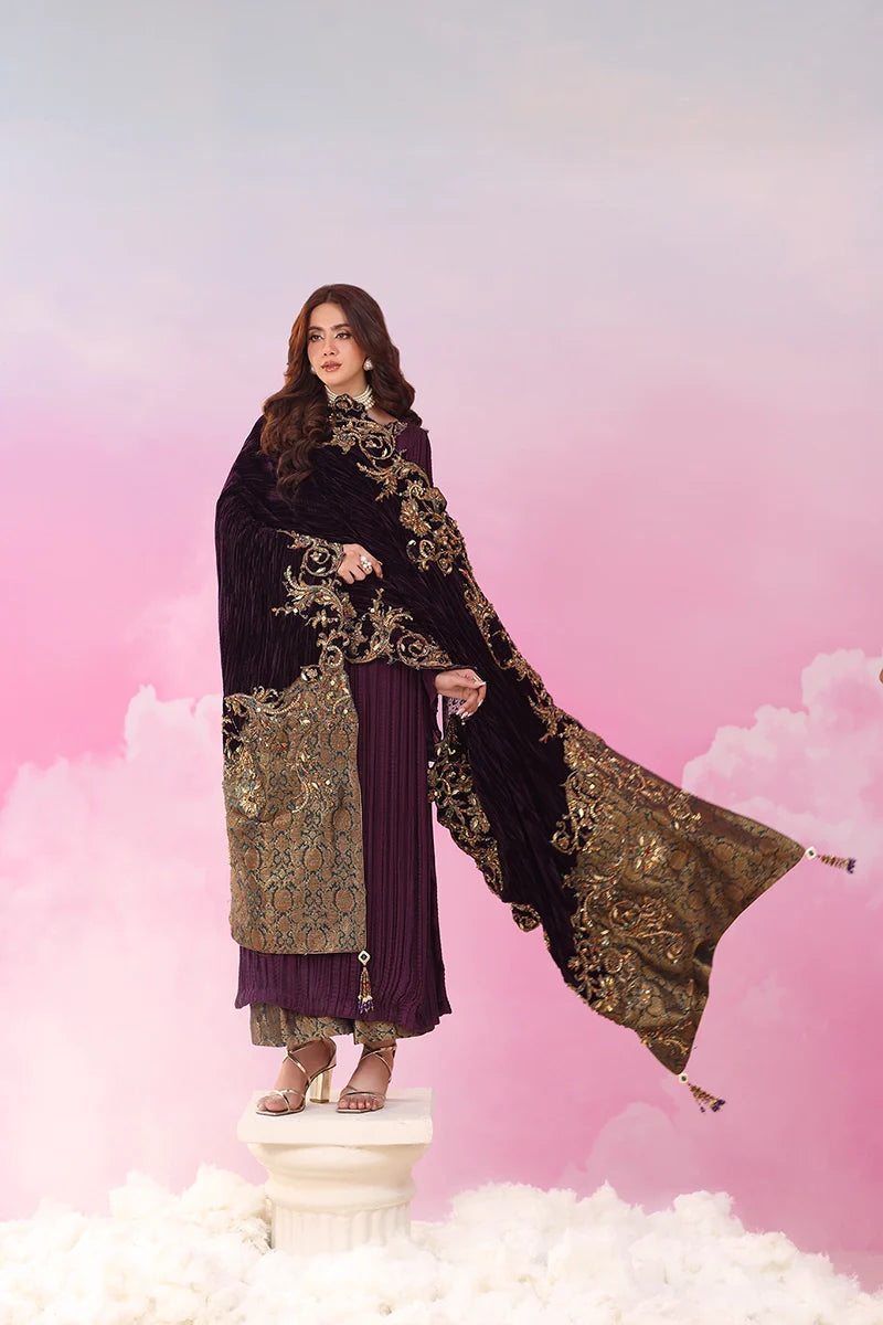 Steeped in regal allure, Amethyst Majesty is a striking composition of deep plum tones and couture artistry. The long crushed chiffon silhouette flows with grace, its flared sleeves touched by tilla embroidery and delicate hand embellishments that shimmer subtly, elevating its refined presence. Paired with contrasting kimkhaab Flared pants, the look is completed with a rich, commanding edge.