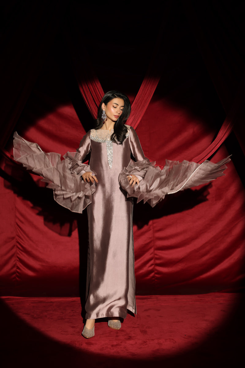 "With Ashé Rosé, I wanted to capture the contrast between a sharp, statuesque silhouette and the soft, dramatic movement of ruffles. The Lilac Ash in pure tissue silk provides a moody, imperial glow, while the crystal hand-embellishment on the neckline adds that signature chic edge. It is a dress for the woman who wants her presence to feel like a cinematic moment." — Musferah Saad