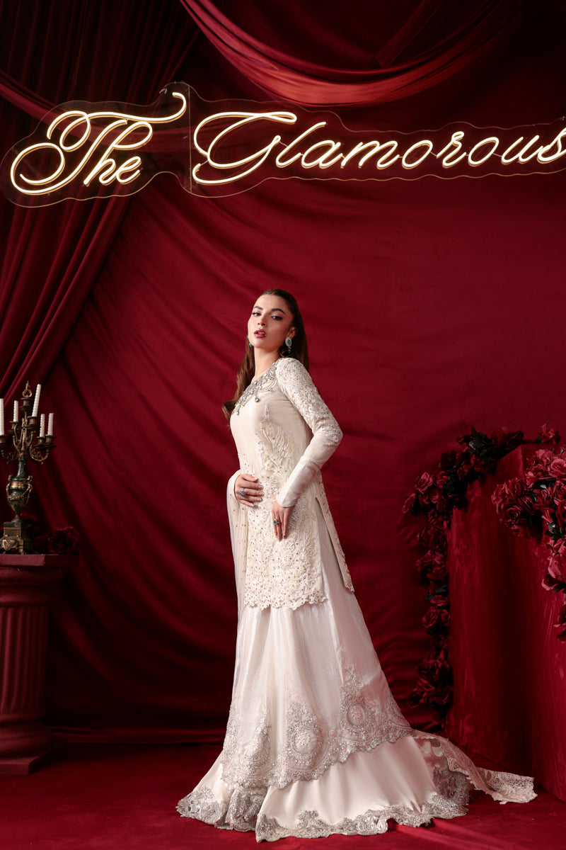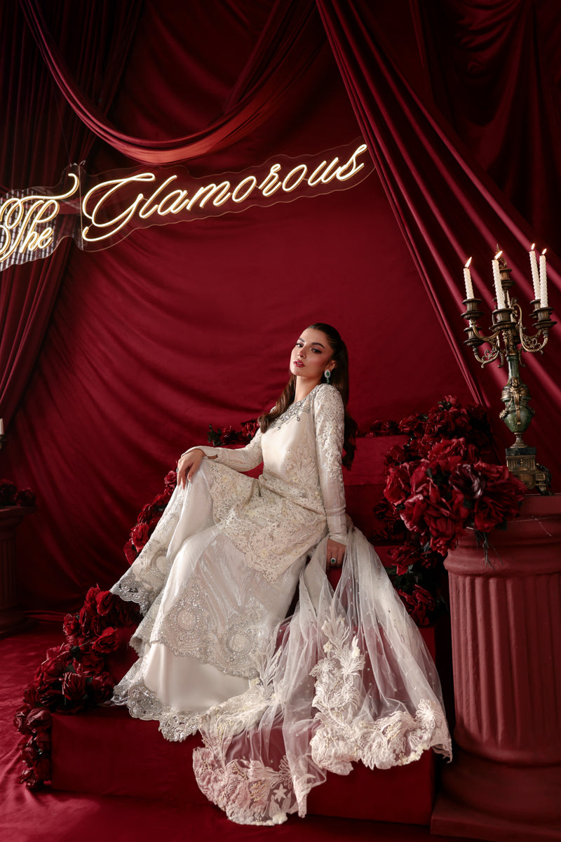 "With Asteria, I wanted to play with the idea of 'celestial layers.' The Royal White net and tensil chiffon lining create a soft, imperial glow, while the Bejeweled Neckline dripping in Swarovski and the double layered sharara add that sharp, architectural edge. It is a dress for the woman who wants her elegance to be both seen and felt." — Musferah Saad