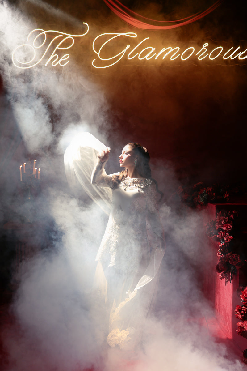 The Swarovski-Encrusted Neckline: A boat Neckline completely hand-embellished with Swarovski crystals and premium stones to create a radiant, jewel-like frame for the face.
