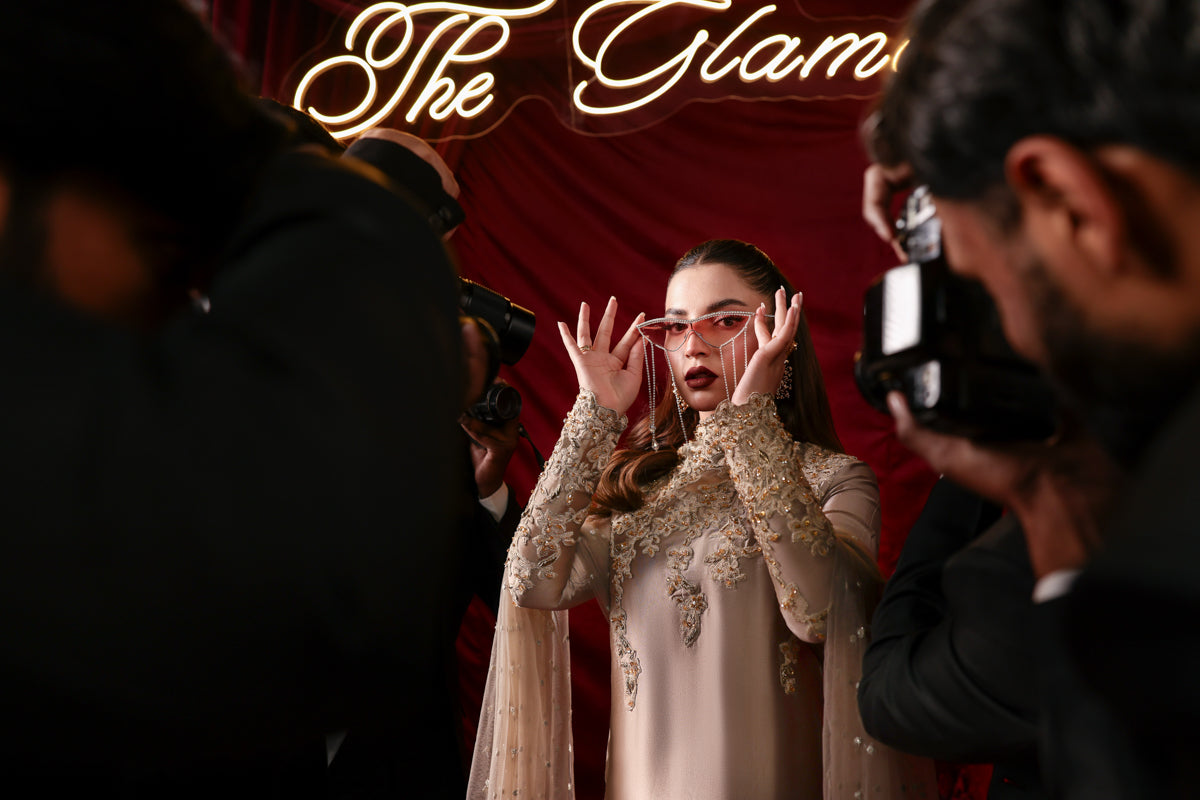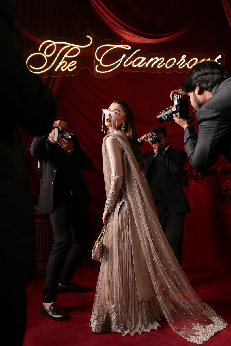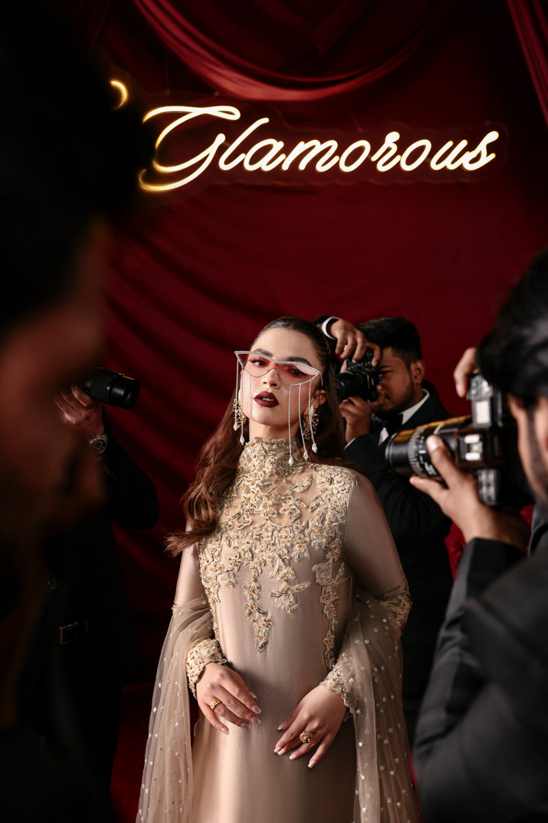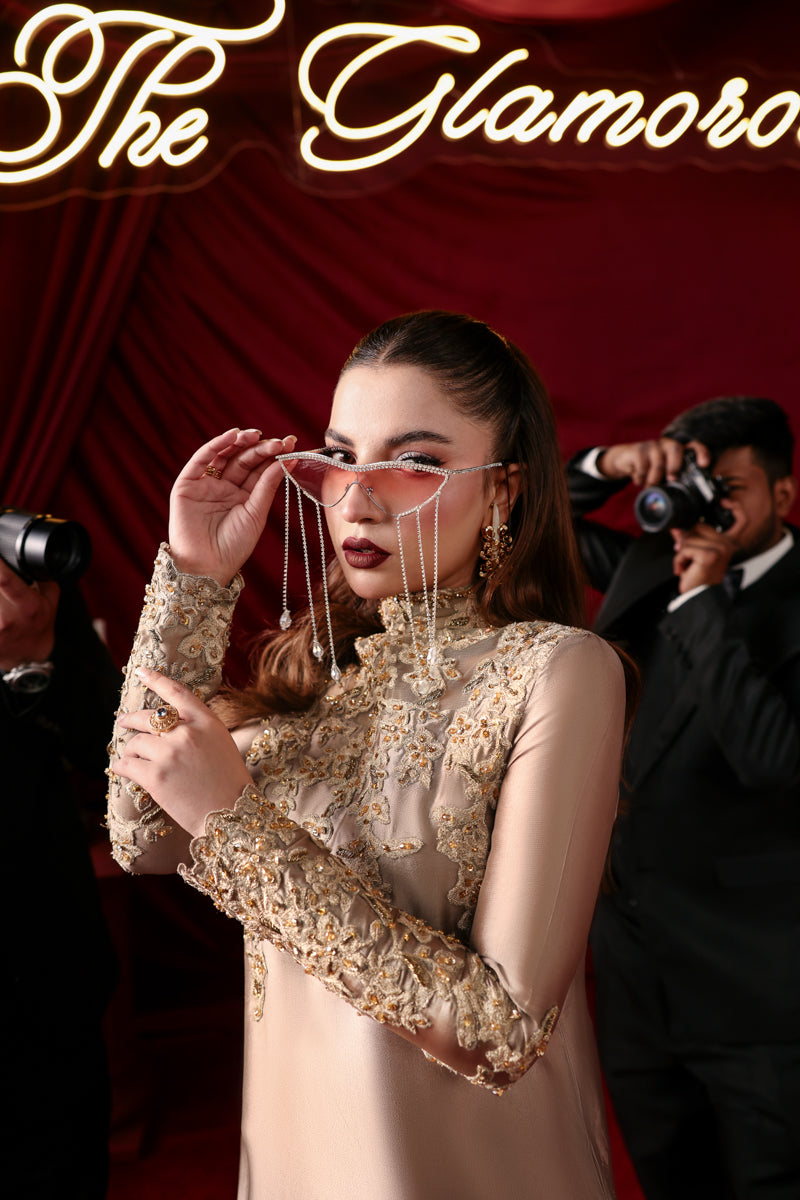 "With this gorgeous Platinum Gold masterpiece, Athena, I wanted to capture the essence of a shimmering dawn. The pure tissue silk provides a soft yet commanding glow, while the High Collar Neckline handworked with the mix of gorgeous gold crystal and cut dana work adds that sharp, chic edge that defines a Musferah Saad woman. It is about being a beacon of light in every room." — Musferah Saad