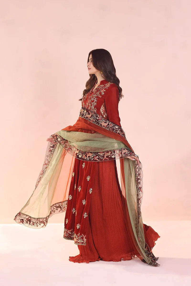 A timeless statement in velvet, Ember Glow captivates with its rich hue and all-over embroidery. The long silhouette is adorned with an intricately worked neckline, sleeves, and scattered sprays, brought to life with resham, tilla, and sequins in layered tones. Kimkhaab side panels lend depth and structure, elevating the sleek form. Paired with a shaded organza dupatta framed in a four-sided embroidered border of resham and tilla, this ensemble embodies regal sophistication with couture artistry. Includes: Shirt & Pants Add on: Dupatta Pouch Fabric Details: Shirt: Premium Velvet (Length = 55’’) Pants: Crush Chiffon ( Length = 45”) Dupatta: Organza (Length 2.75 yards) Size Customize: Yes Color Customization: Yes Delivery time: 2-3 weeks Note: We have made every possible effort to display the color of the products accurately. However, the possibility of difference between the actual color and the display color might exist because of various types of screens and displays.
