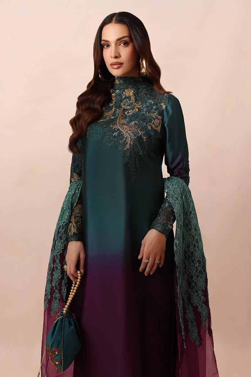 Defined by its absolutely gorgeous ombré shading, Emerald Dusk is a Musferah Saad exclusive in both color and craftsmanship. The sleek long shirt is elevated with a high lace neckline adorned with intricate tilla embroidery and delicate motifs, lending it an aura of chic regality. The emerald-to-plum gradient creates a mesmerizing transition of tones, emphasizing the uniqueness of the palette. Paired with an organza and lace dupatta that echoes the detailing, this ensemble embodies contemporary elegance with couture refinement.
