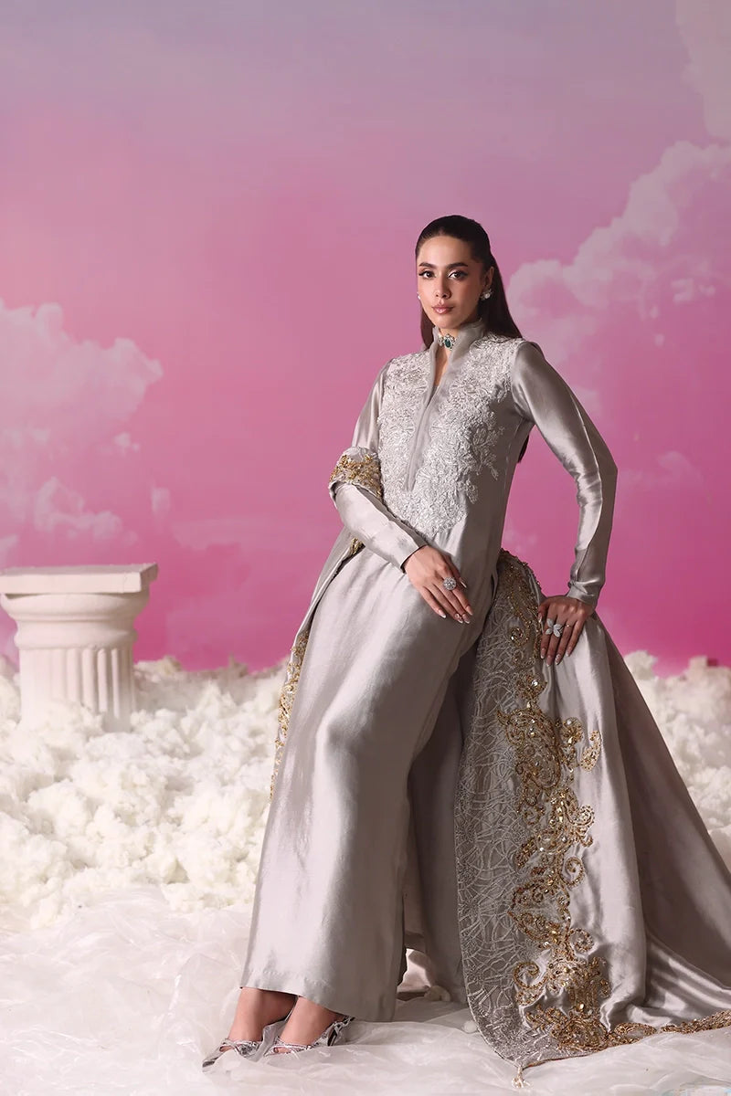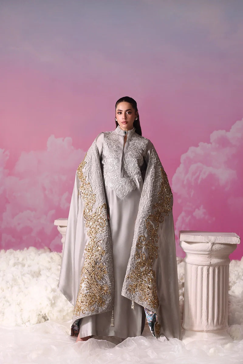 Lunar Mist captures the serenity of moonlit elegance, blending couture precision with ethereal charm. The straight-cut long shirt is elevated with a triple-layered organza collar, detailed in silver tilla and resham embroidery delicately worked with sequins, while pearl accents and loop finishes on the sleeves lend a touch of eccentric chic refinement.