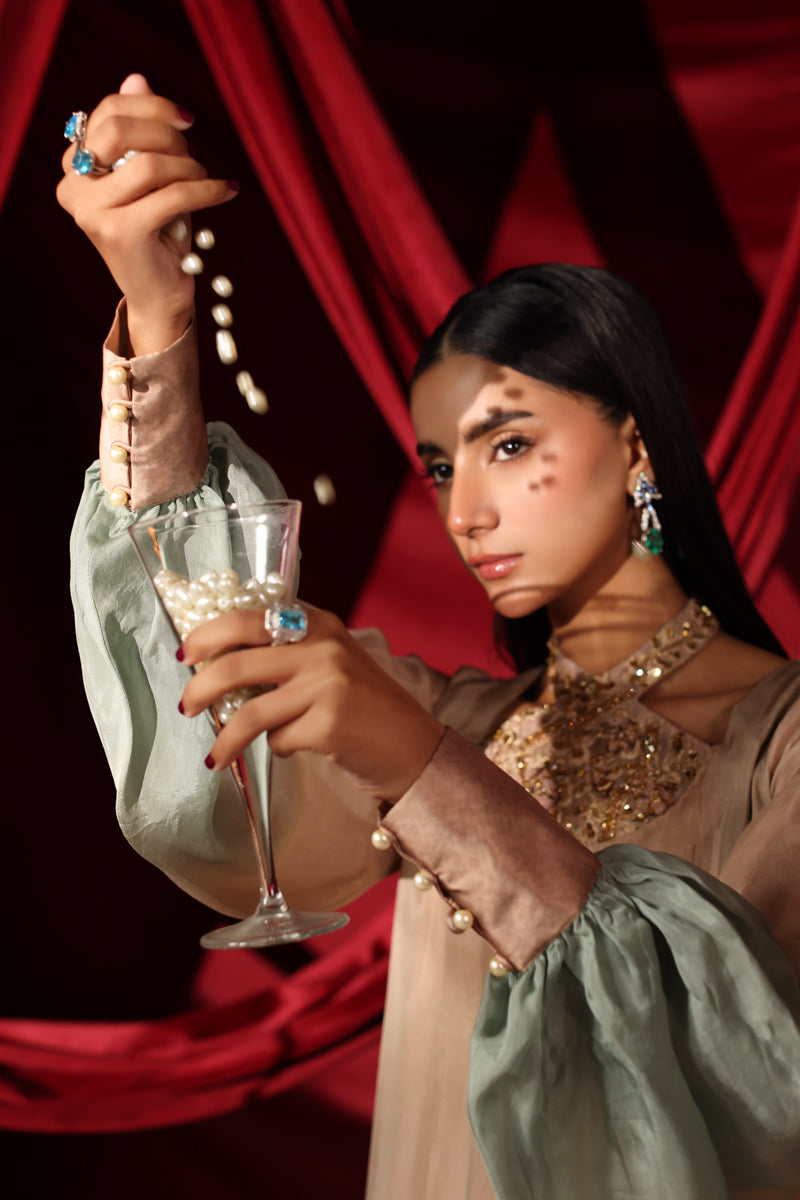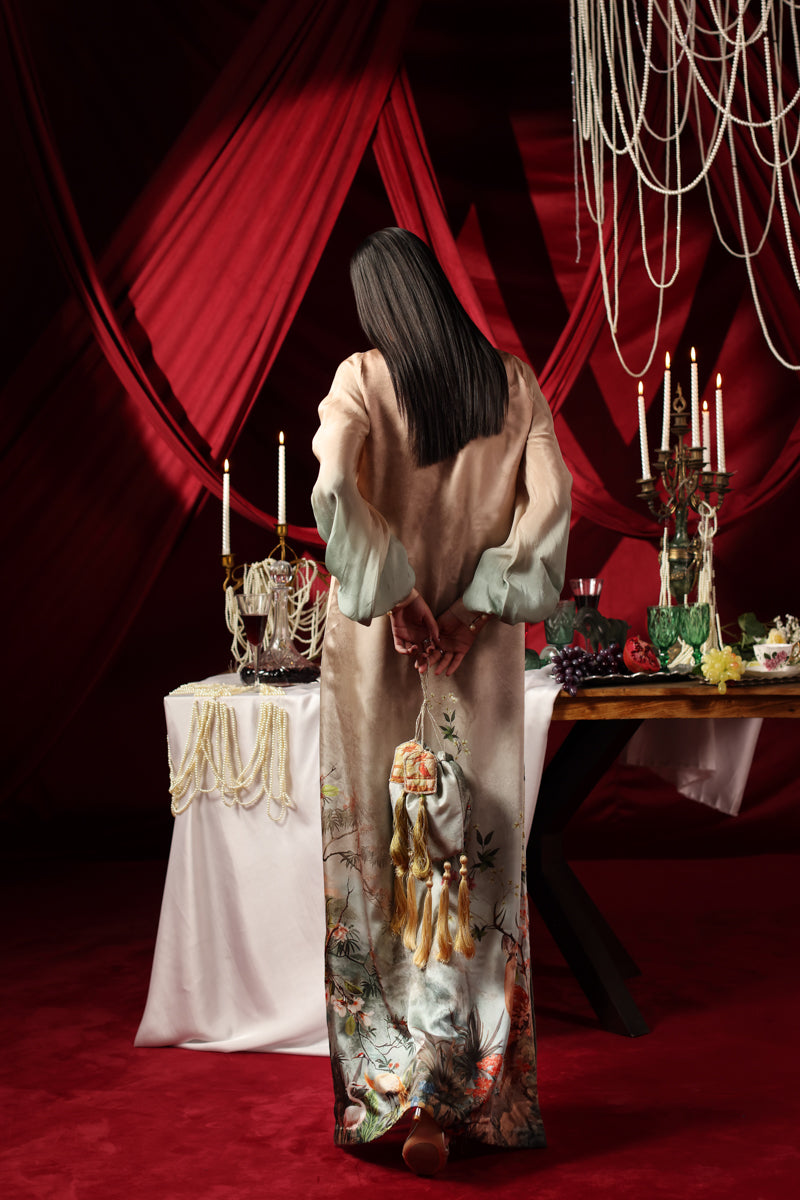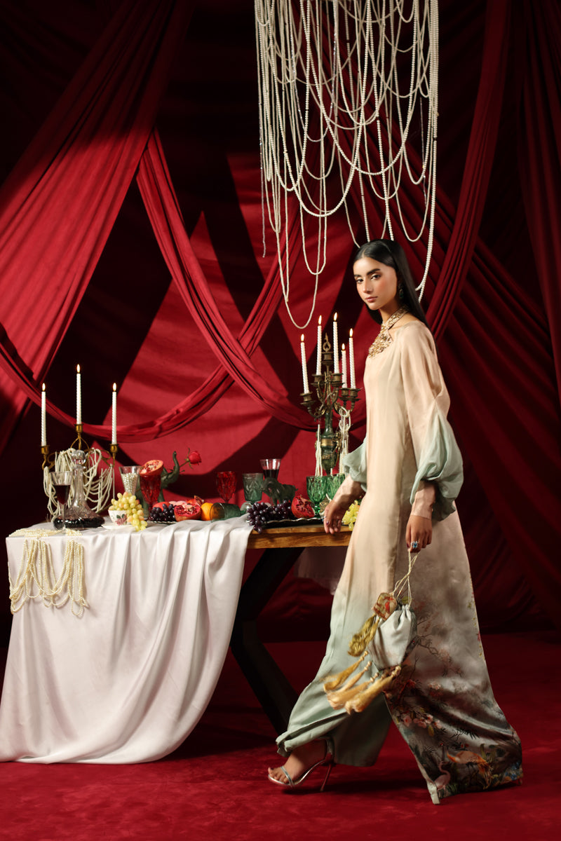 Ombre Grace is a stunning study in movement and editorial elegance, designed for the woman who commands the room with a quiet, "bougie" confidence. Drenched in the sophisticated tones of Ombre Sandstone Garden, this Silk kaftan silhouette is a celebration of soft, pleated couture motion. Musferah Saad’s personal research into tonal gradients led to this fluid design, curated to provide a statuesque presence that feels both effortless and high-fashion.