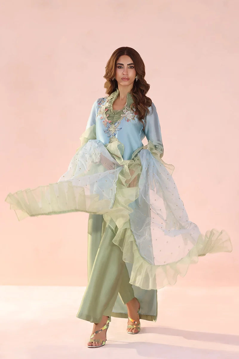 Pastel Mirage blends shades of mint green into ice blue for a serene, dreamlike effect,exclusive to Musferah Saad. The neckline is crafted with delicate net frills overlaid with fine embroidery, while resham threads and tilla work add intricate depth to both the neckline and sleeves. Paired with an embroidered organza dupatta edged in airy frills, this ensemble captures the essence of pastel luxury with a chic, couture sensibility.