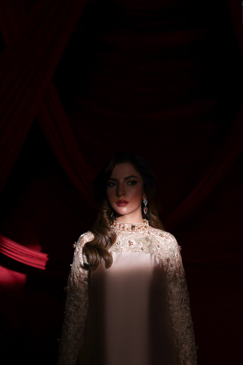 "With Rosaline, I wanted to create a 'second-skin' of light. The Blush Champagne silk is incredibly flattering, while the hand-embellished shells and cut dana work add that signature sharp, high-fashion detail that makes this piece truly unique. It’s a garden in bloom, but with a modern, chic soul." — Musferah Saad