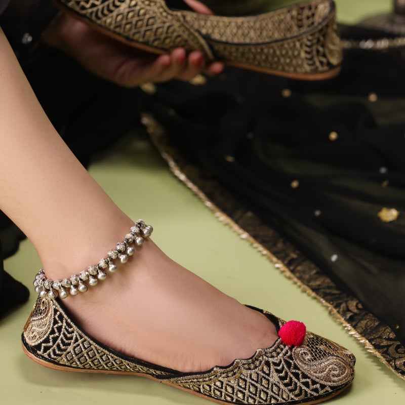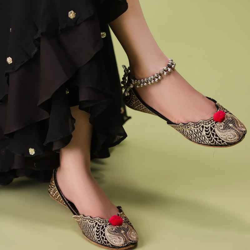 Our Naqsh-e-Zar khussa features intricate metallic-gold tilla embroidery hand-stitched across a sumptuous black velvet upper, edged with matching velvet piping and finished with a plush velvet insole for luxurious comfort. As each pair is entirely handcrafted, subtle variations in thread density and motif placement make yours truly one-of-a-kind. Style them with rich jewel-toned shararas and oxidized silver jewelry for festive evenings, or let their golden pattern accent a sleek monochrome kurta set for refined elegance. To preserve the delicate tilla work, gently blot away any dust with a soft, dry cloth and store in a cool, dry place—ideally in a dust bag—away from direct sunlight.