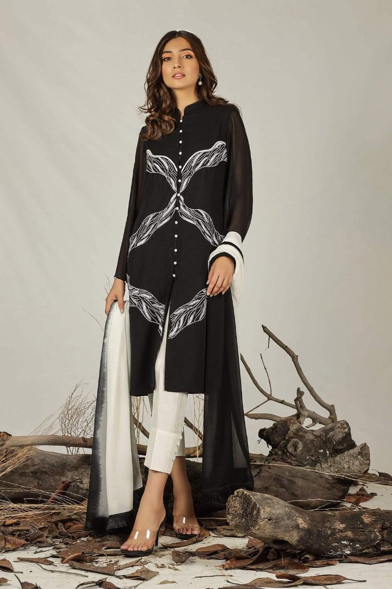Skillfully designed with bold white linear embroidery juxtaposed against black, the aore tunic in a is a modern take on feminine style. it features a band collar and is detailed with pearl buttons. With a clean cut midi-length silhouette and two toned dupatta - wear it with a pair of tailored pants for a modern summer look.