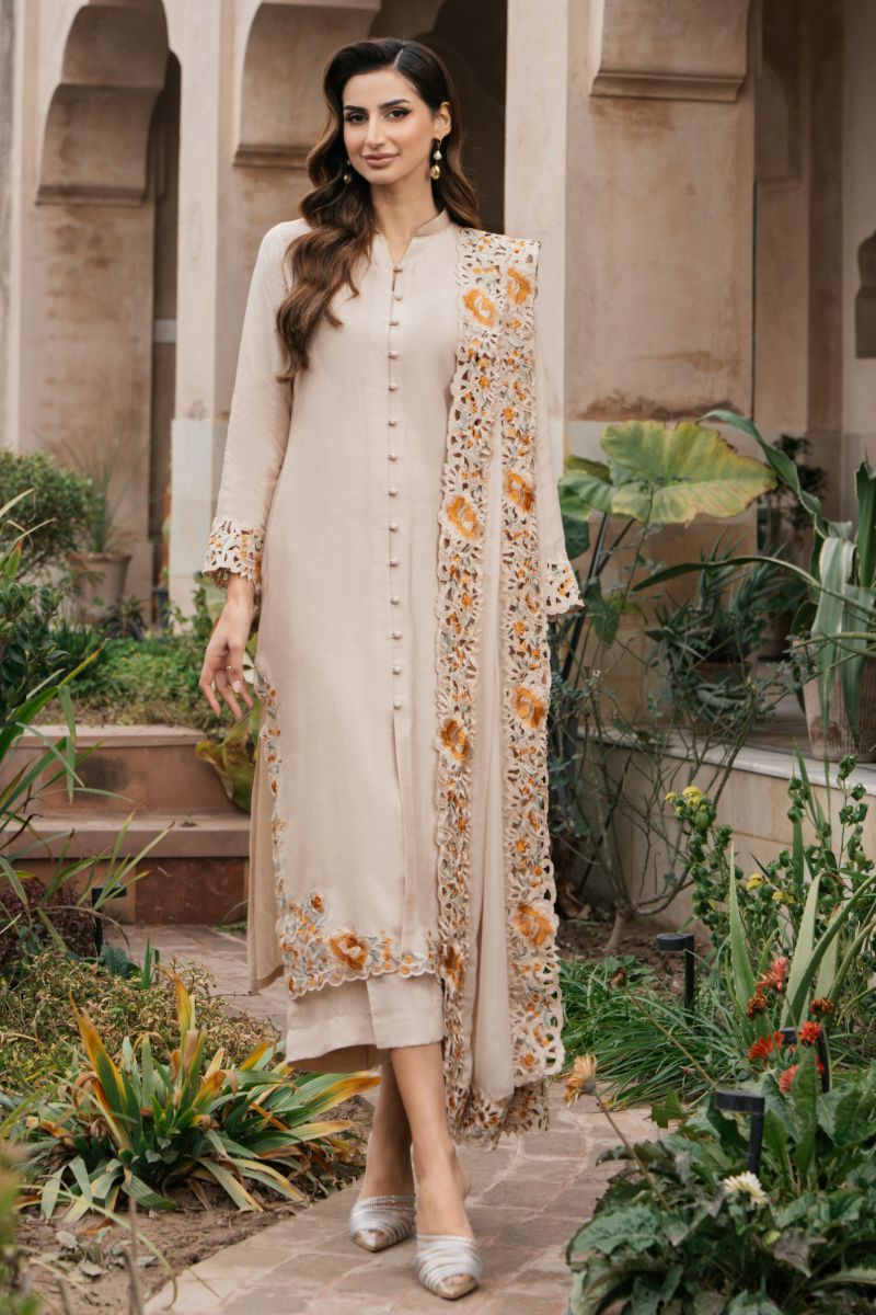 A biscuit long-hemmed canvas is adorned with statement self-embroidered cutwork. Juxtaposed with blooms in hues of mustard, sage and off white to offset this front open monochromatic silhouette. Featuring filigree across the daman and sleeves. It is perfectly suited to the season's events, it is the go-to piece for any occasion.