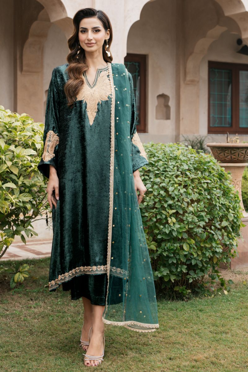 Emerald green has a quiet strength. It is decadently rich, but not over saturated- so it can be deployed top-to-toe. This timeless two-toned silk is cut to a midi length phiran silhouette featuring expertly constructed kashmiri embroidery. Accessorize this regal ensemble to suit the occasion.