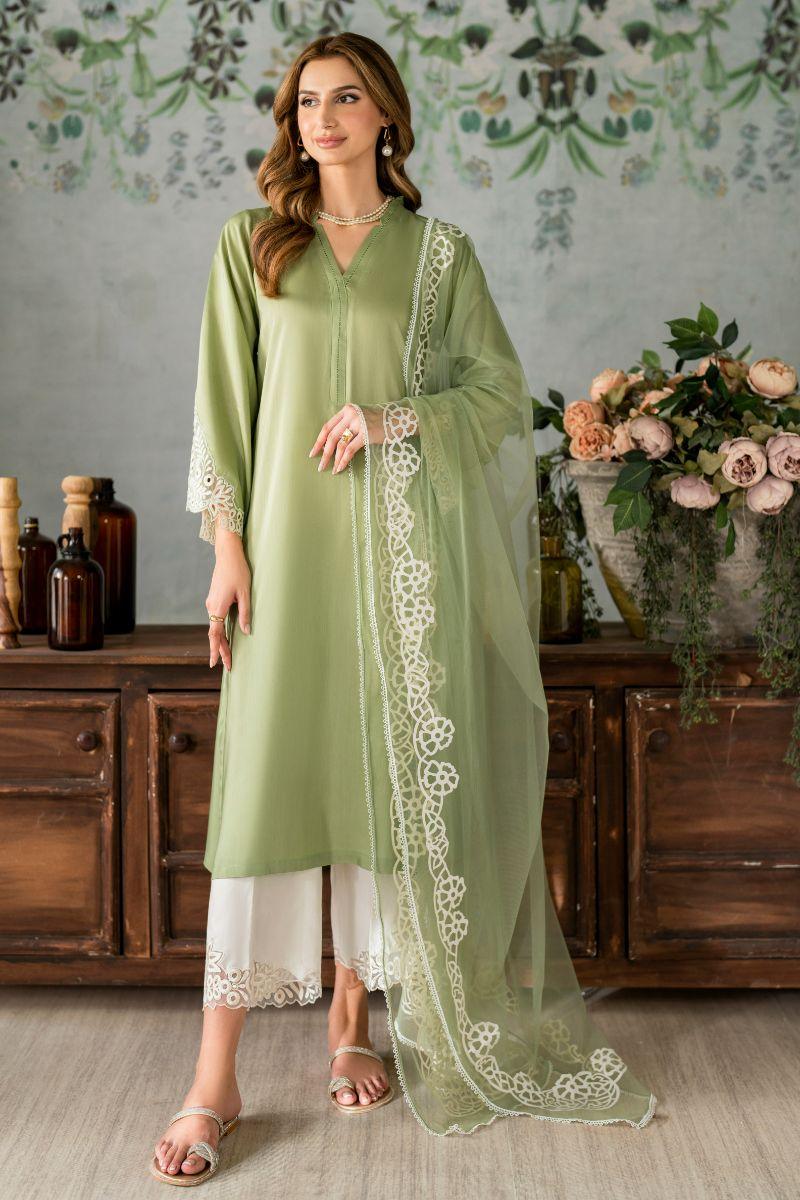 Composition Tunic: Viscose Silk Pants: Viscose Silk Dupatta : Net with applique Dry Clean Only Apple green tunic with embroidered sleeves (three piece set) Lean into a soft mood this season. This apple green tunic is cut to a straight-fit silhouette with embroidered schiffli sleeves. An ode to spring- our heavily adorned dupatta features applique filigree like ivy juxtaposed in white. Pair with with our wide-leg trouser detailed with scalloped embroidery for a feminine look.