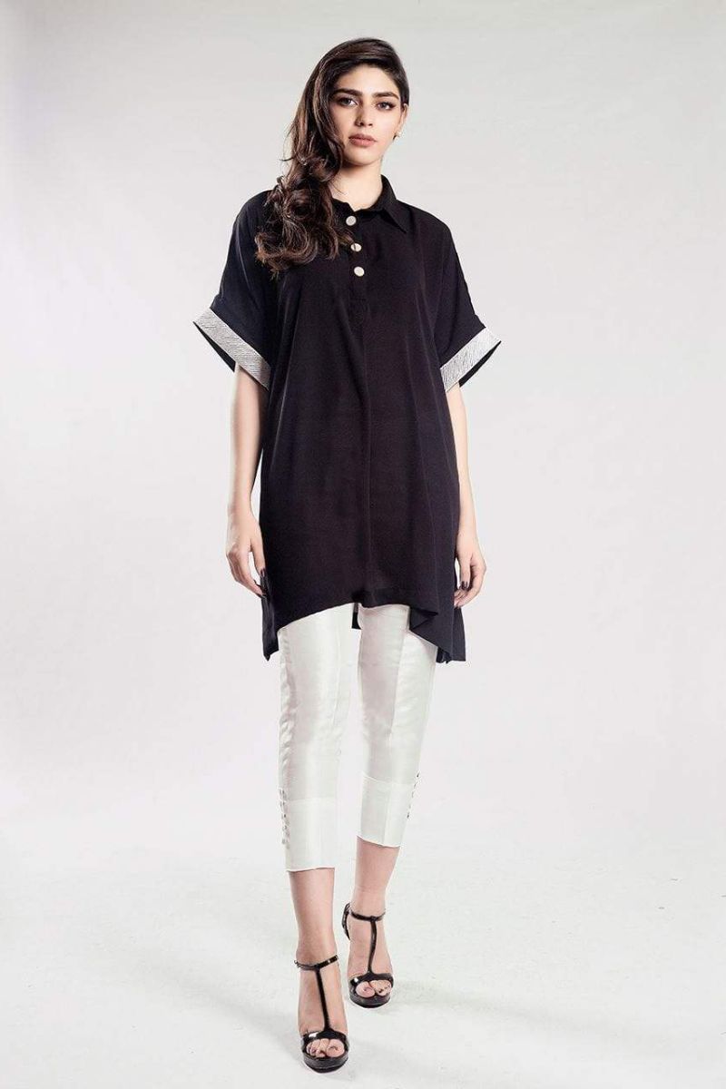 Offering a real contemporary edge to the classic kurta, this seamlessly stitched tunic is an all season staple! Featuring juxtaposed white linear embroidery along the sleeves. It is enhanced with metallic buttons along the neckline and sleeves. This ensemble is a formal yet fashionable way to reboot your classic occasionwear staples. Sharpen the look with metallic accessories or add soft nude sandals for a summer twist