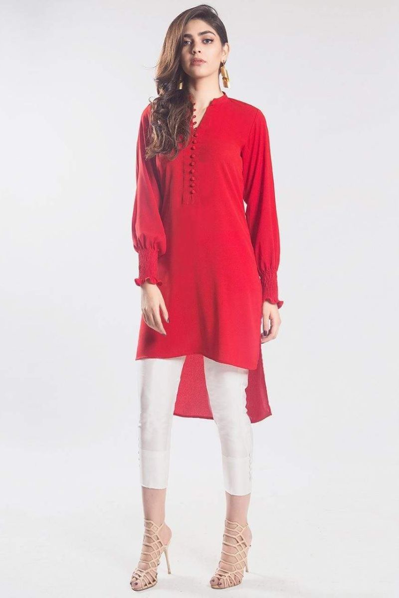 Equal parts contemporary and classicl! This crimson red tunic features unqiue cinched smoked cuffs. The neckline has a band collar and a string of buttons along the front. It features a higher length in the front and longer length in the back. The silhouette is demure yet flirtatious! Stylish and functional- wear it both ways!
