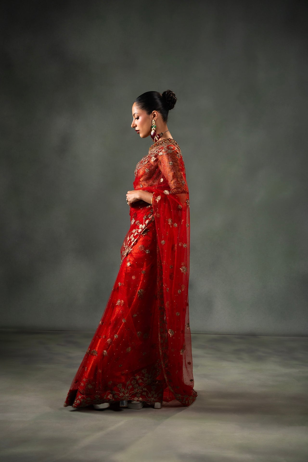 The cardinal red tones of the saree is complemented by a rich bronze kimkhawab blouse adoured with semi-precious stones and swarovskis.
