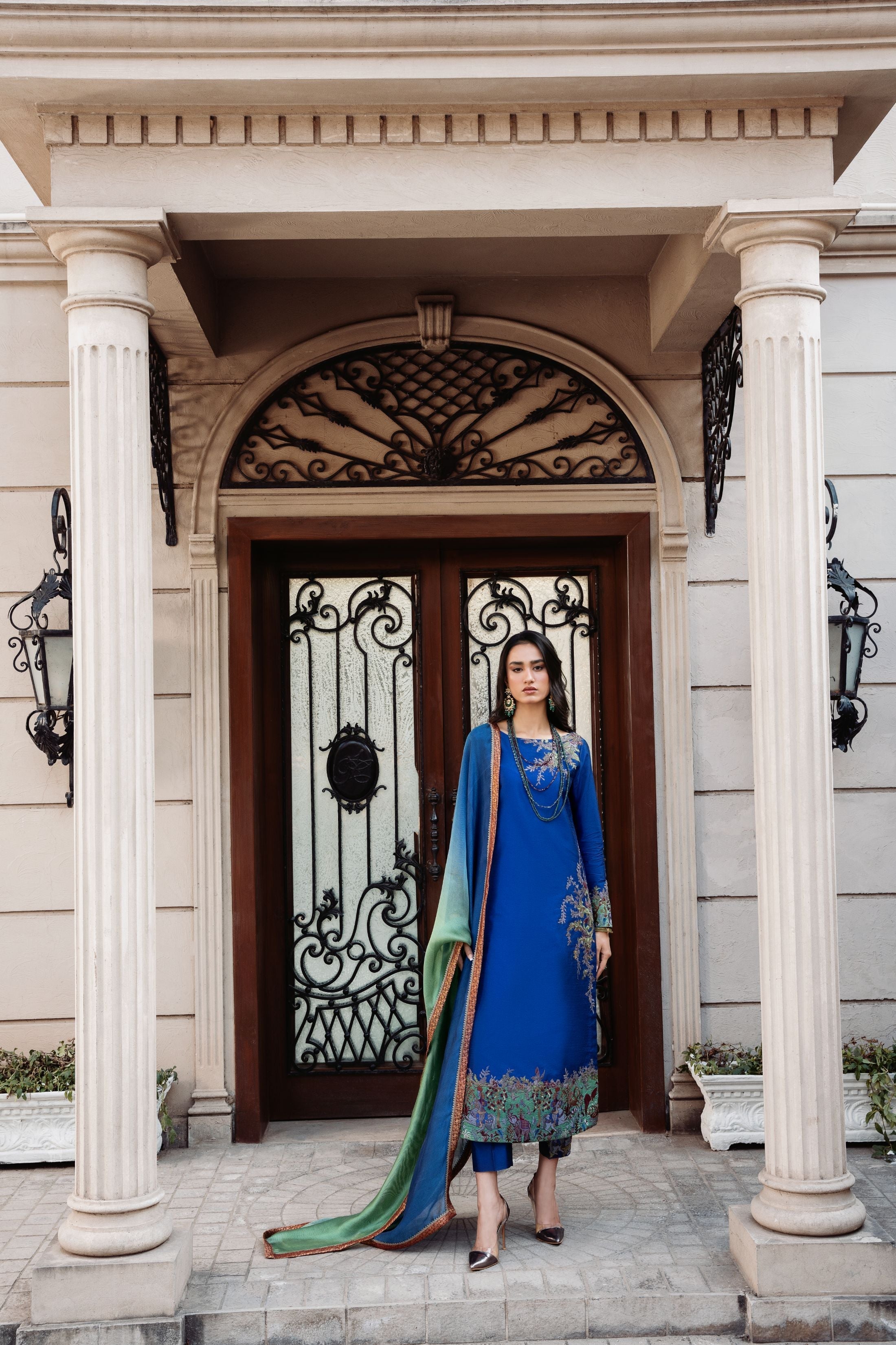 Zumara is crafted in premium raw silk and tailored into a silhouette that moves with effortless command. Bold royal blue forms the canvas — where deep indigo reigns and emerald whispers of legacy. Verde green borders frame the design like royal manuscripts, while intricate embroidery unfolds across the fabric, inspired by Persian miniature hunting scenes — stories of valor and beauty woven seamlessly with nature’s floral poetry.