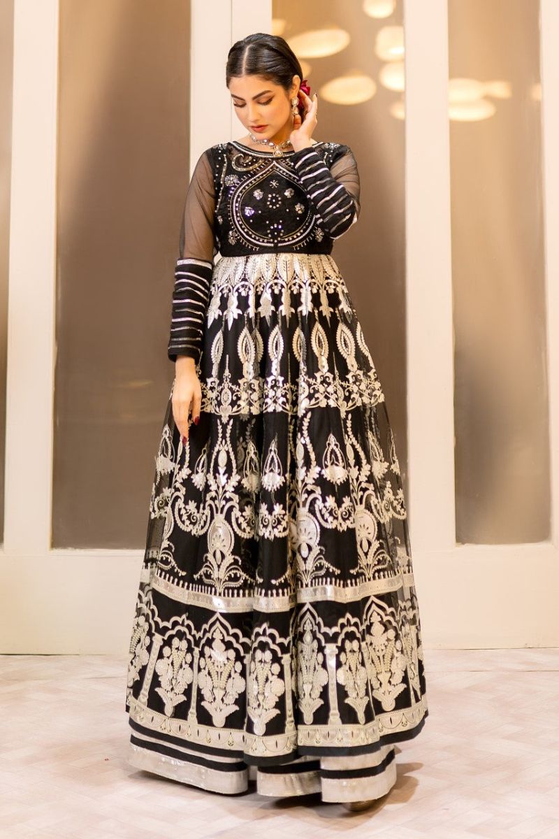A gorgeous double layered embossed flock printed tulle gown rendered in delicate adda work with a cerulean black and silver hue, this ensemble carries an intricately embroidered neckline with cut dana, pearl and thread paired with a decadently embroidered bodice in an exquisite floral motif with hints of silver accompanied by embroidered borders for hemline and rounds of embroidered borders for the hemline and accompanied by a net dupatta with silver tamba kiran.