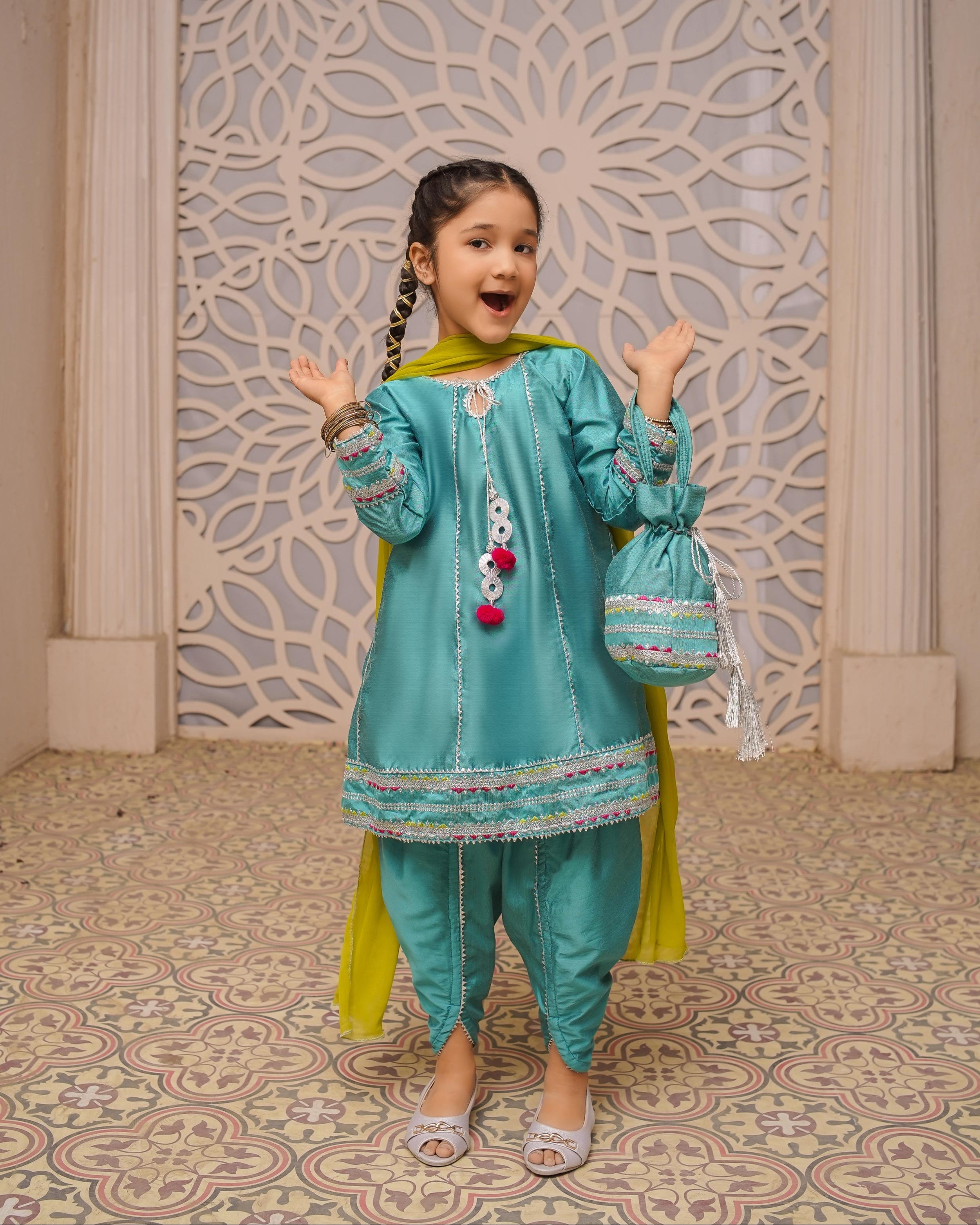 Dress your little princess in timeless elegance with this exquisitely crafted Top-Panel Frock featuring delicate two-toned Zari embroidery with silver accents. The intricate handmade tassels on the front add a charming touch, making it perfect for festive occasions.