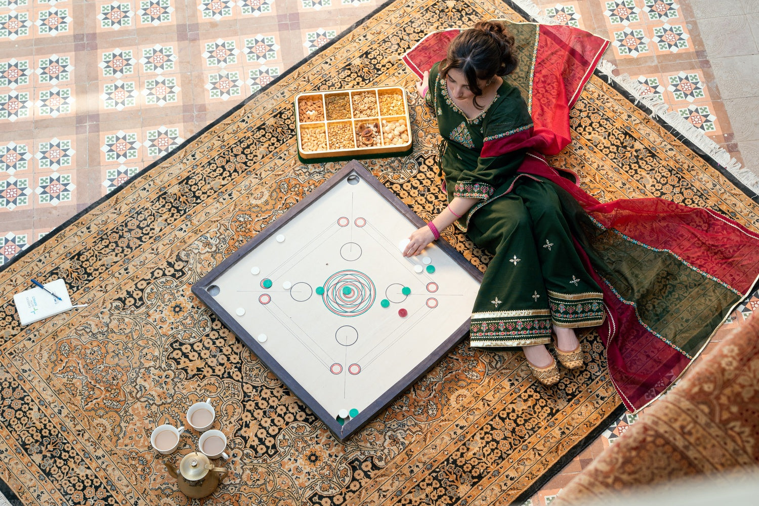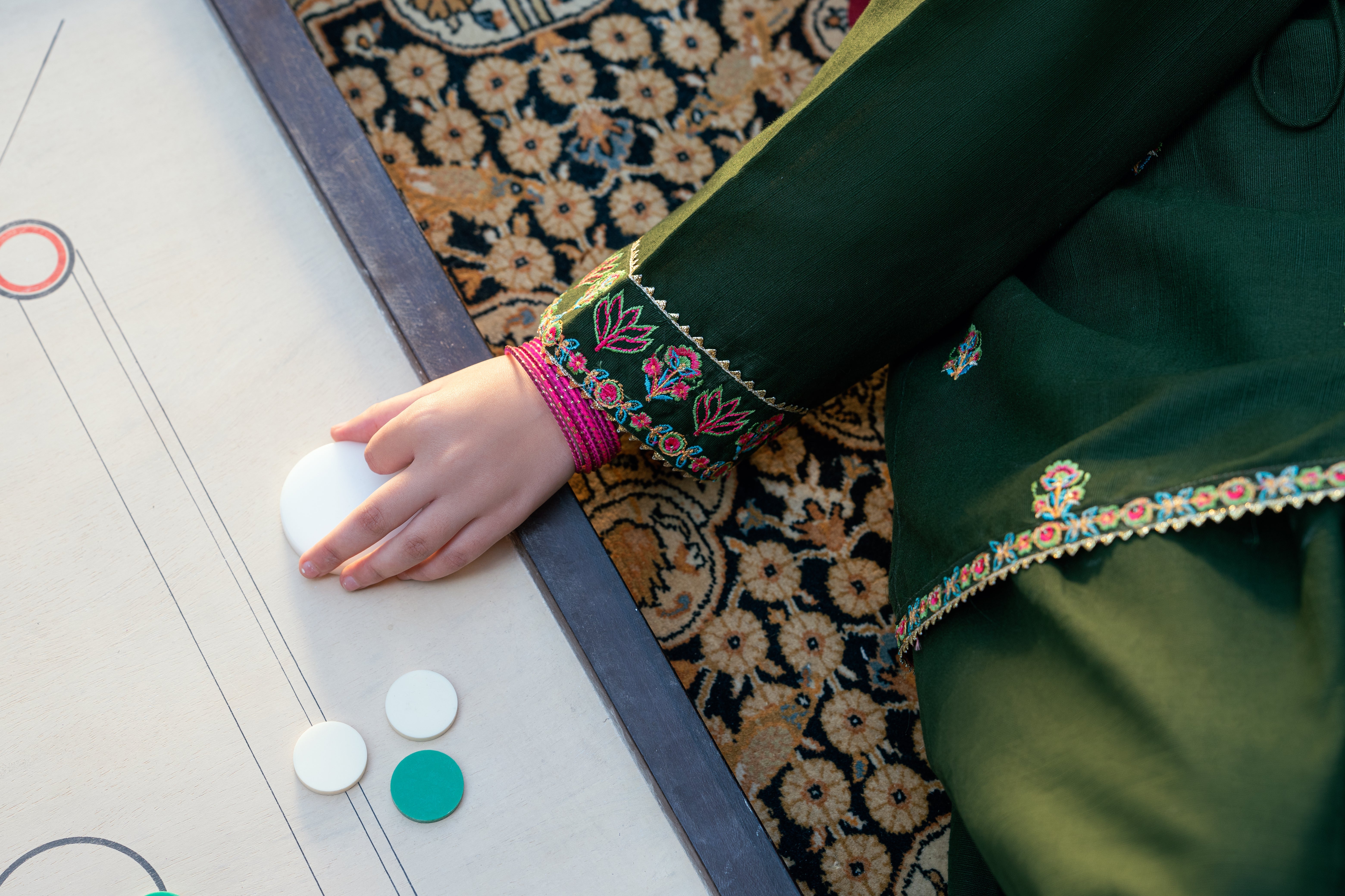 Shirt: Dark green khaddar short round daman shirt with colorful embroidery and tassels on front.