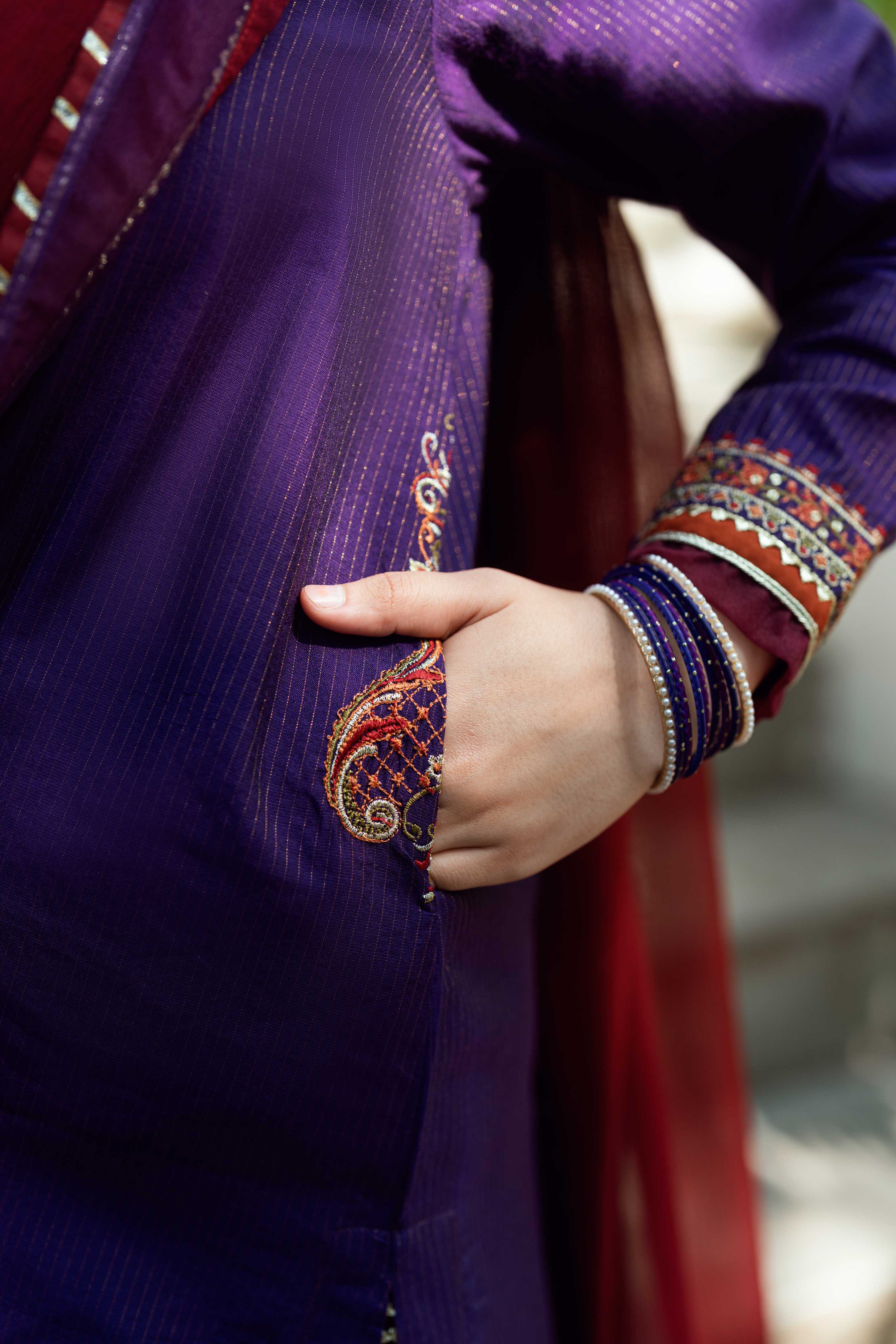 Shirt: Purple cotton susi long A-line shirt with scallop embroidered hem and embroidered bunches on daman. Embroidered neckline with rust accents and color pop on sleeves. Embroidered pockets finished with gota details.