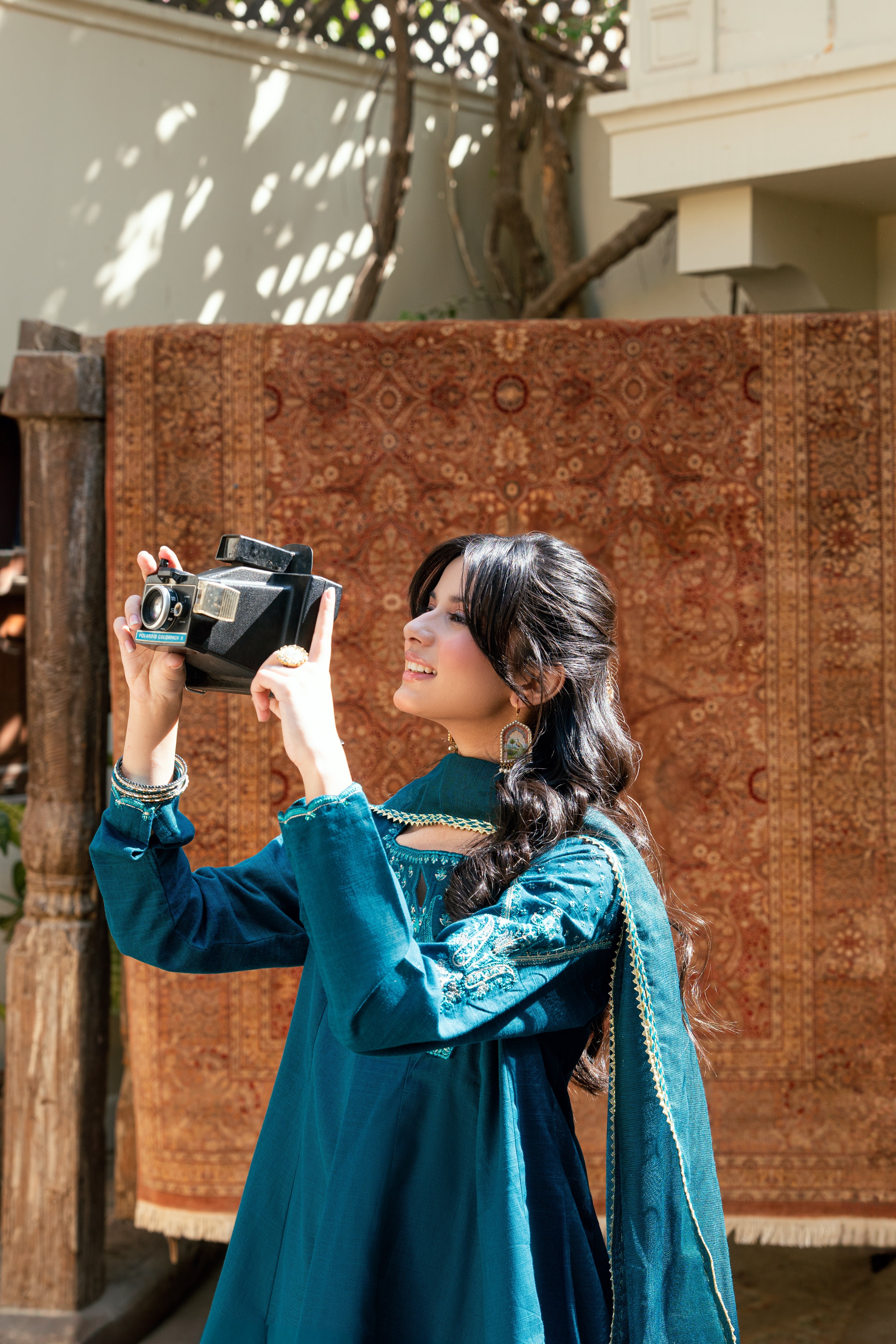 Shirt: Teal khaddar short kalidaar frock with monotone embroidery and sequins details, featuring square neckline with a diamond cut and finished with intricate laces.